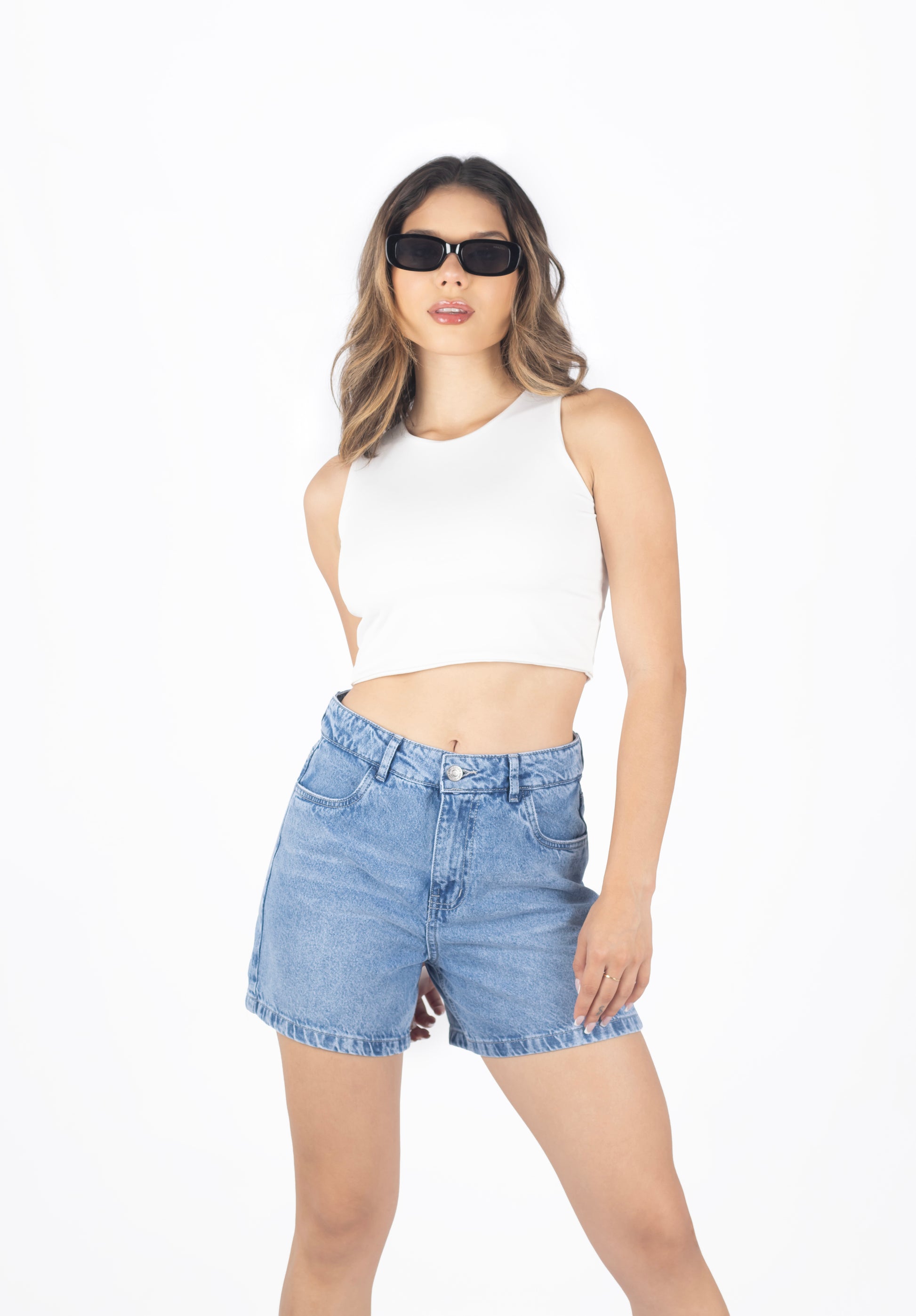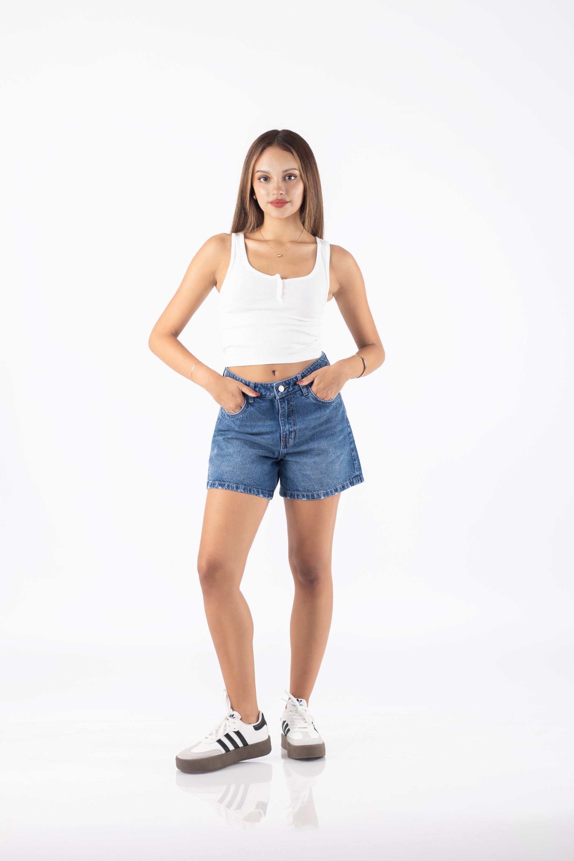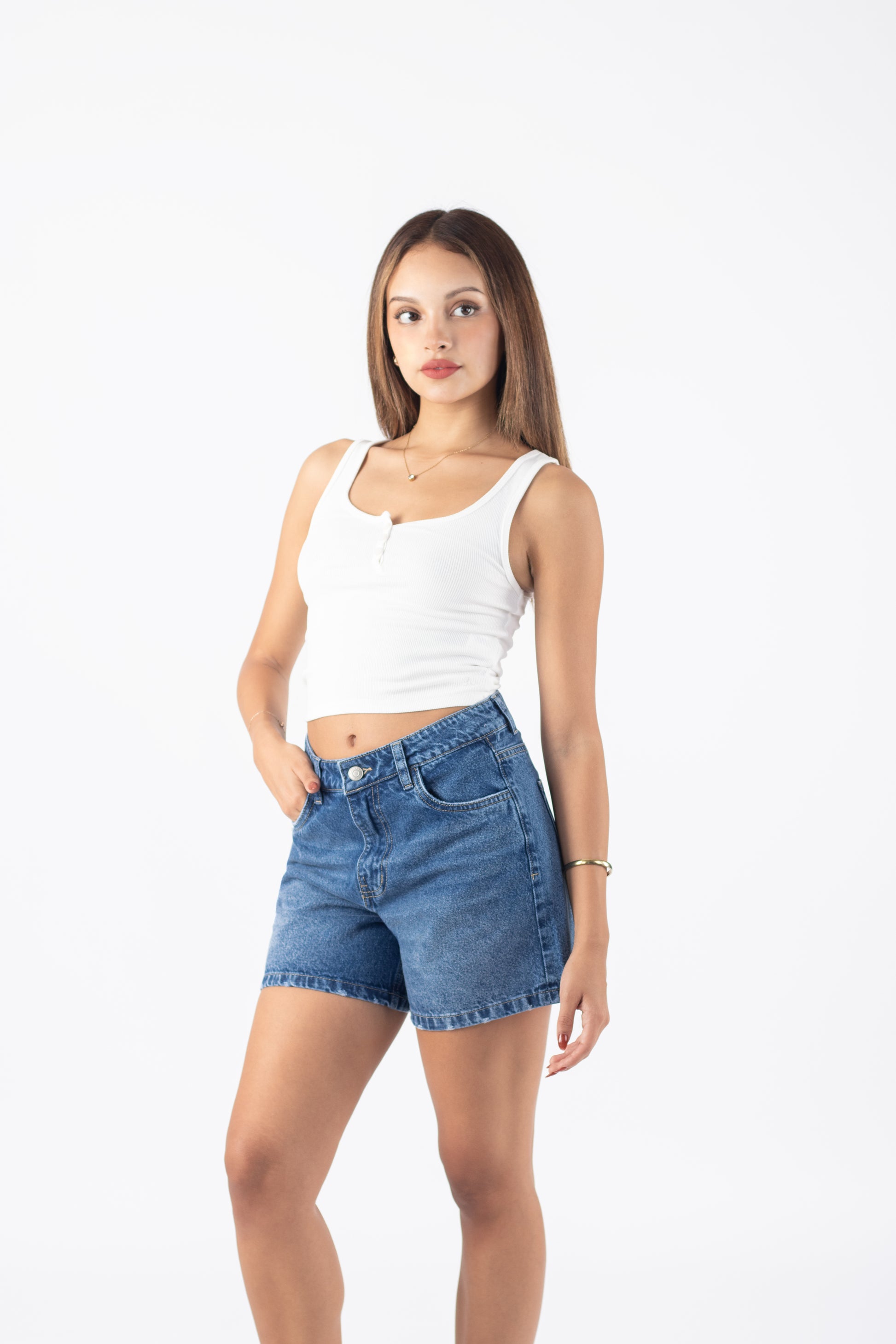 Denim rígido, de tiro medio, con bolsillos delanteros y traseros.
