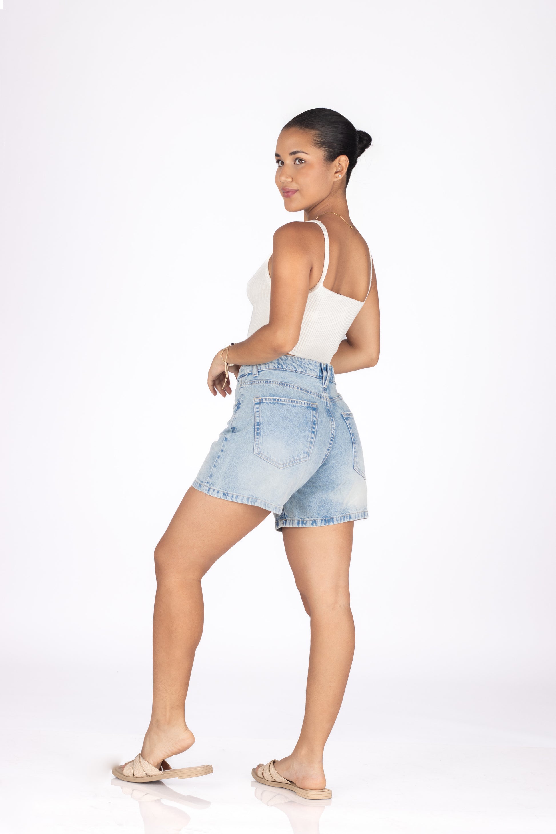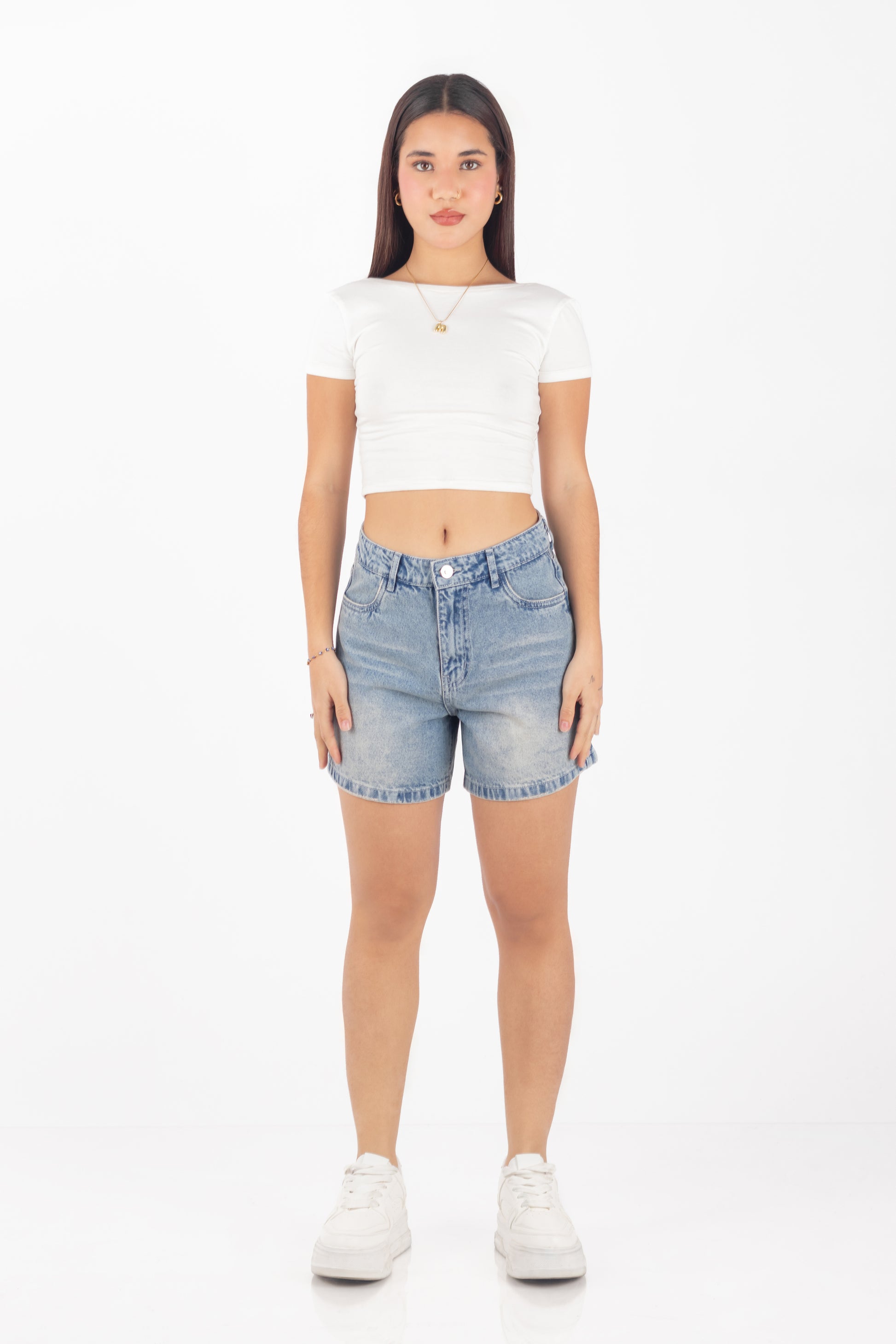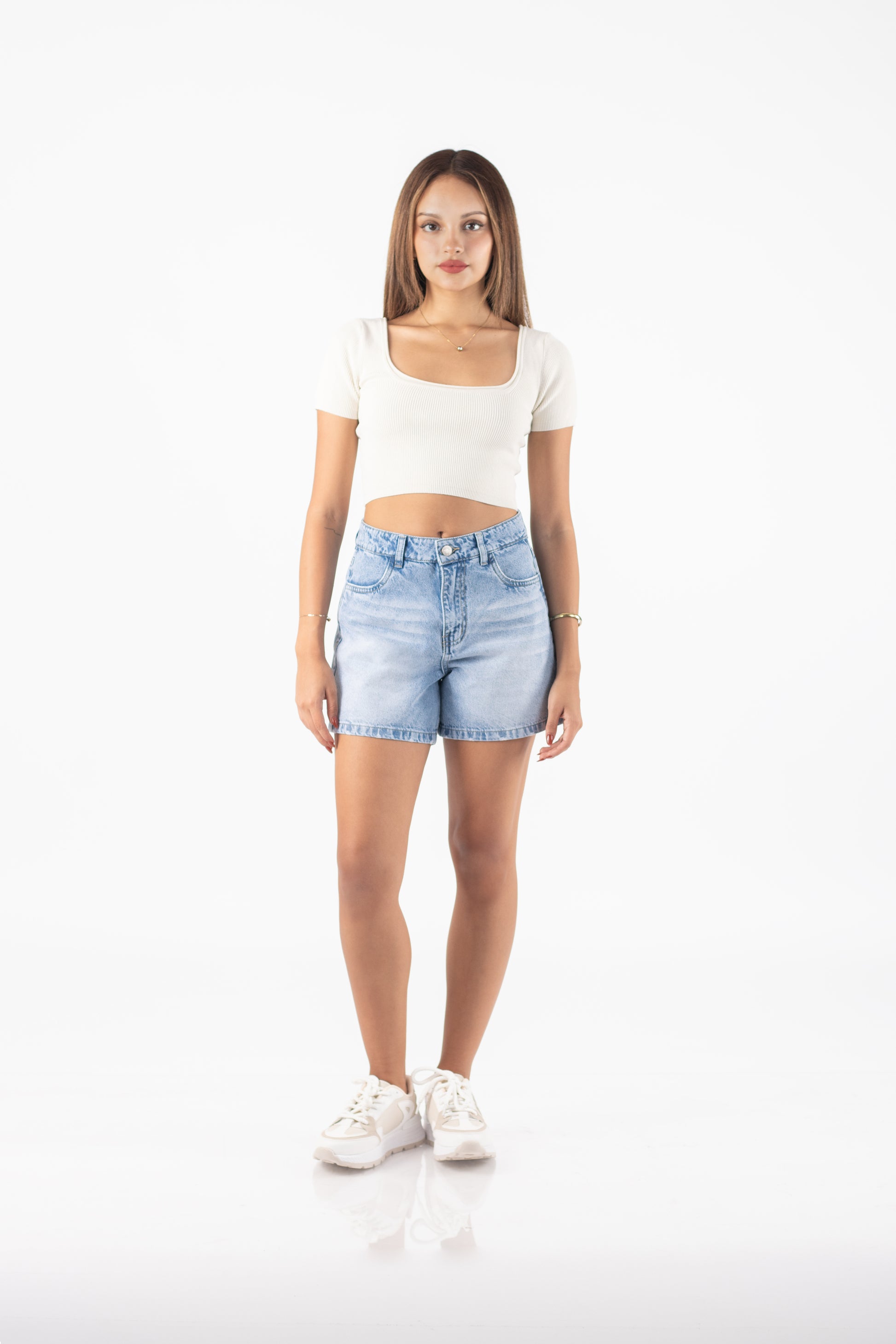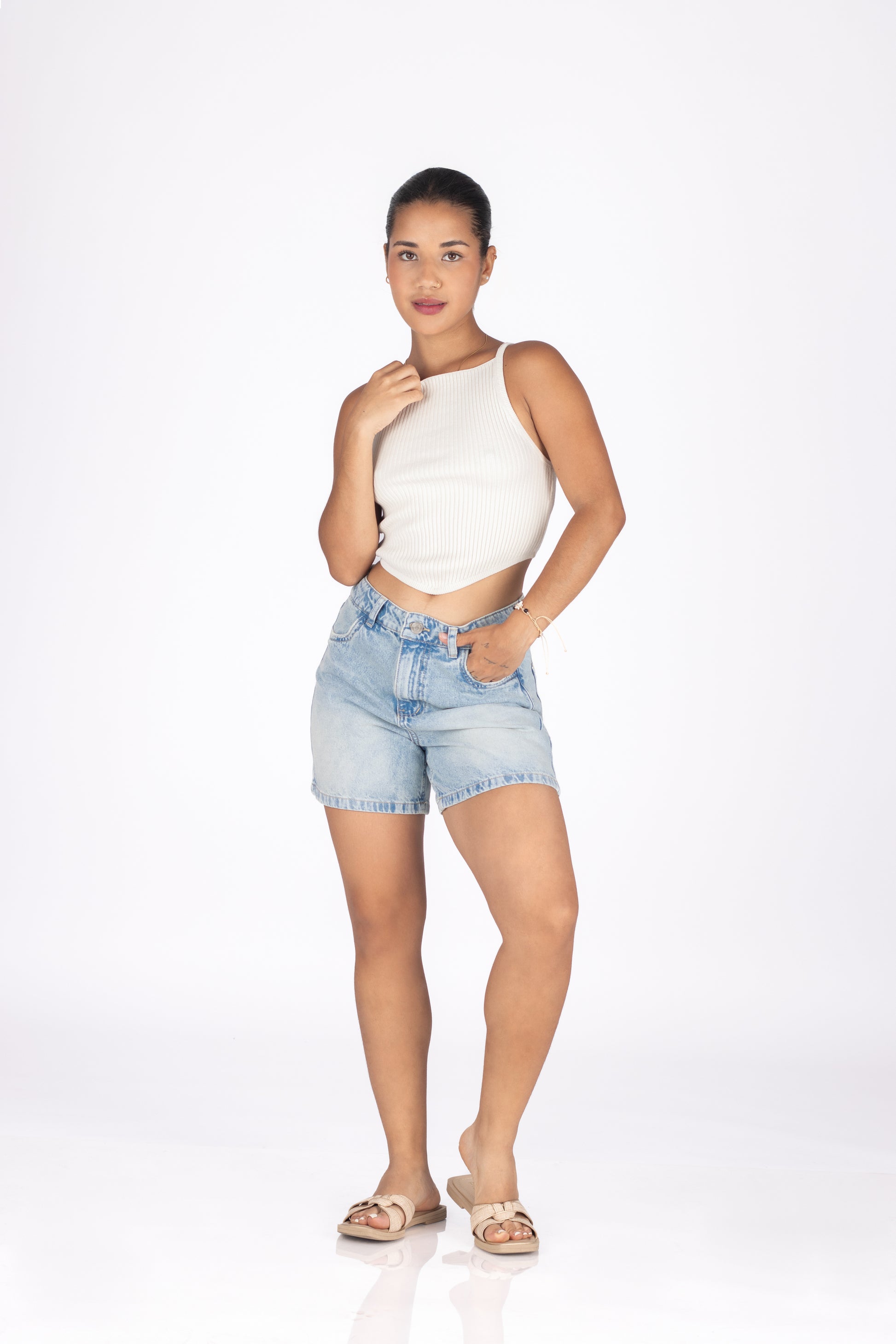 Denim rígido, de tiro medio, con bolsillos delanteros y traseros.