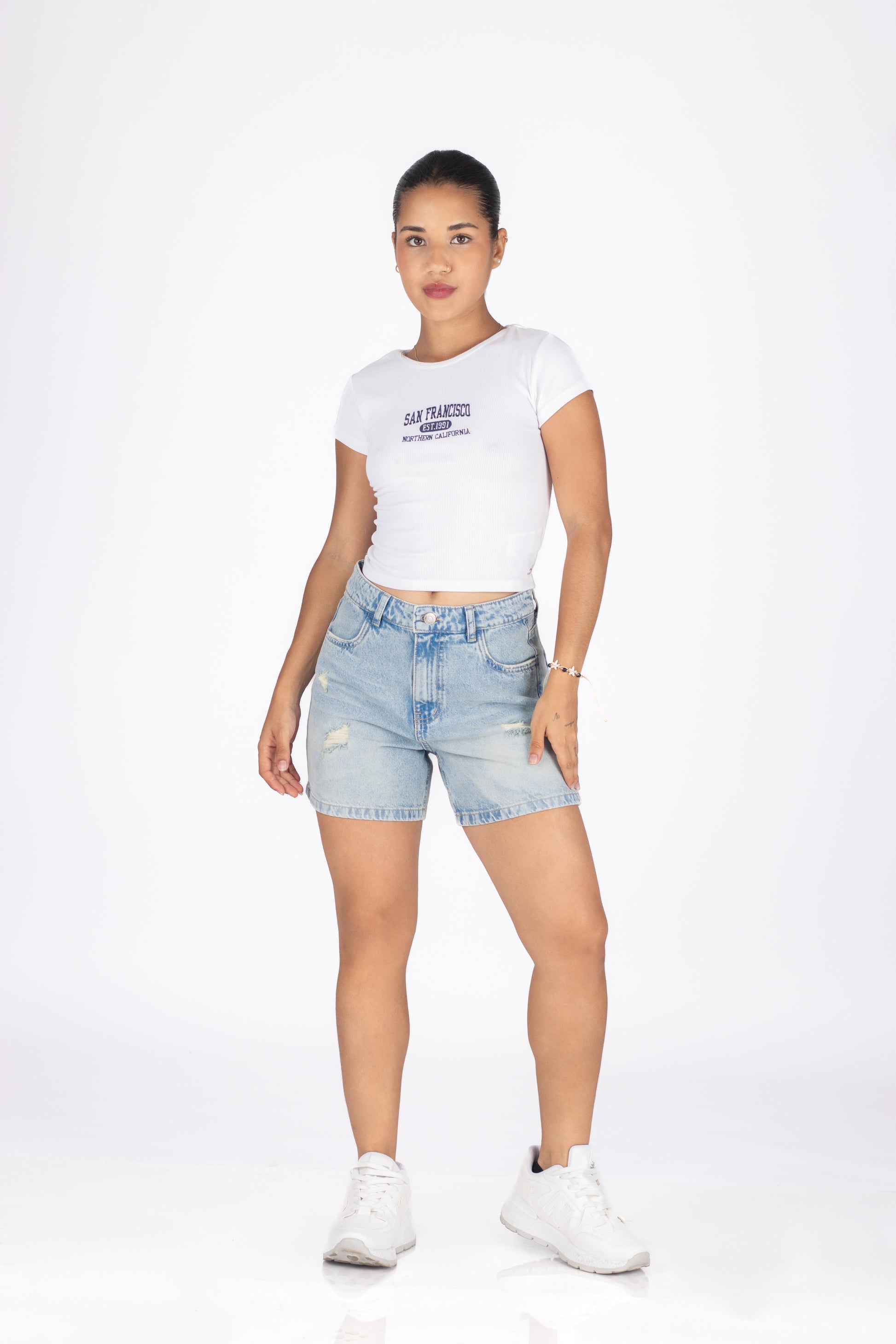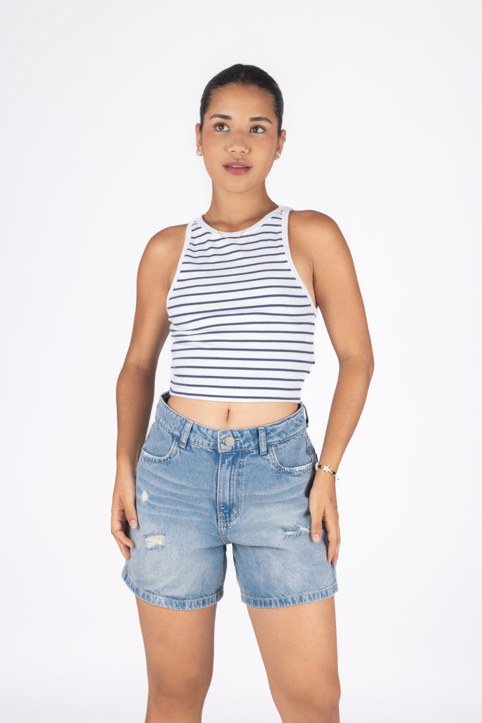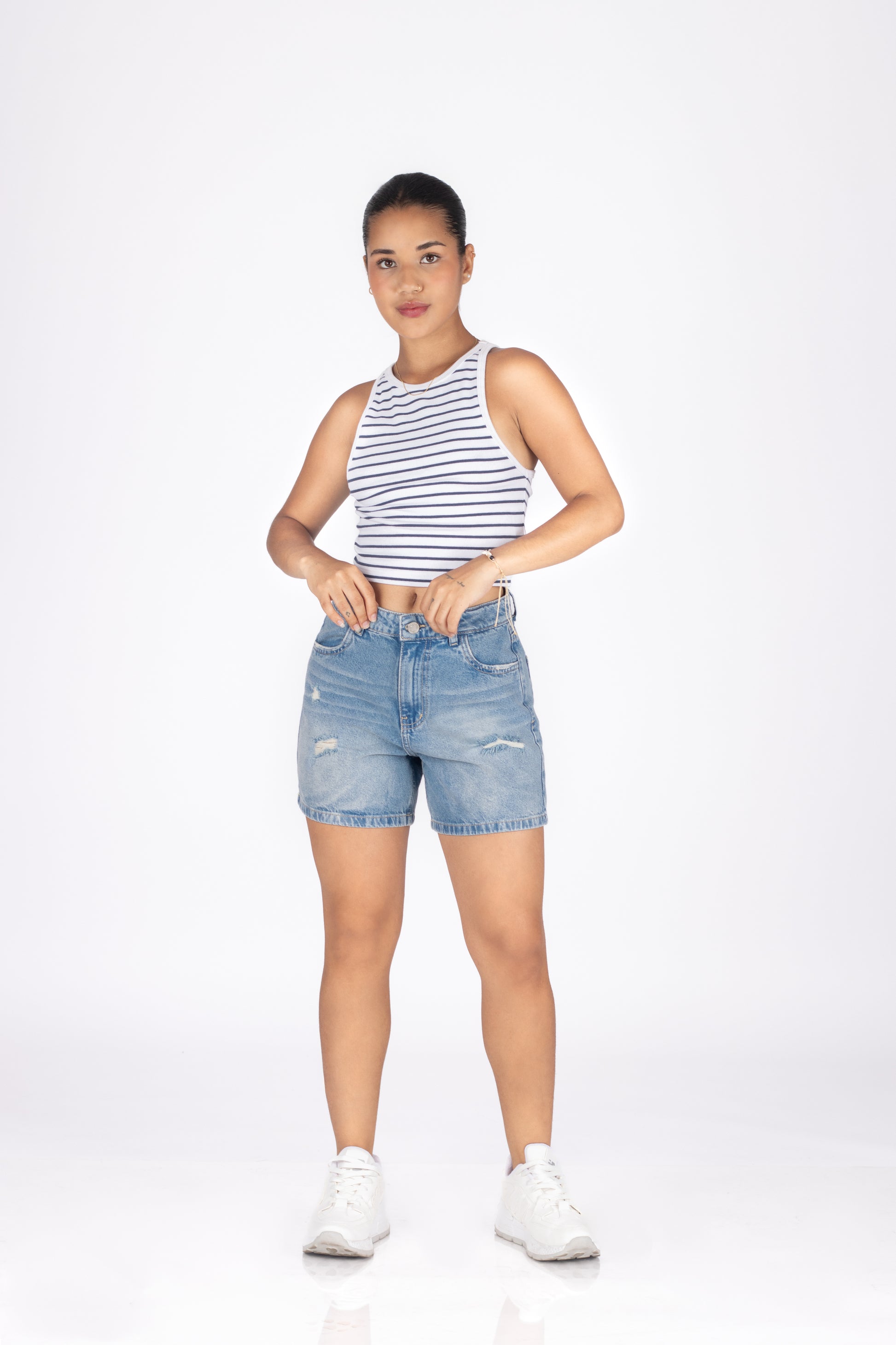 Denim rígido con pequeños rasgados, de tiro medio, con bolsillos delanteros y traseros.