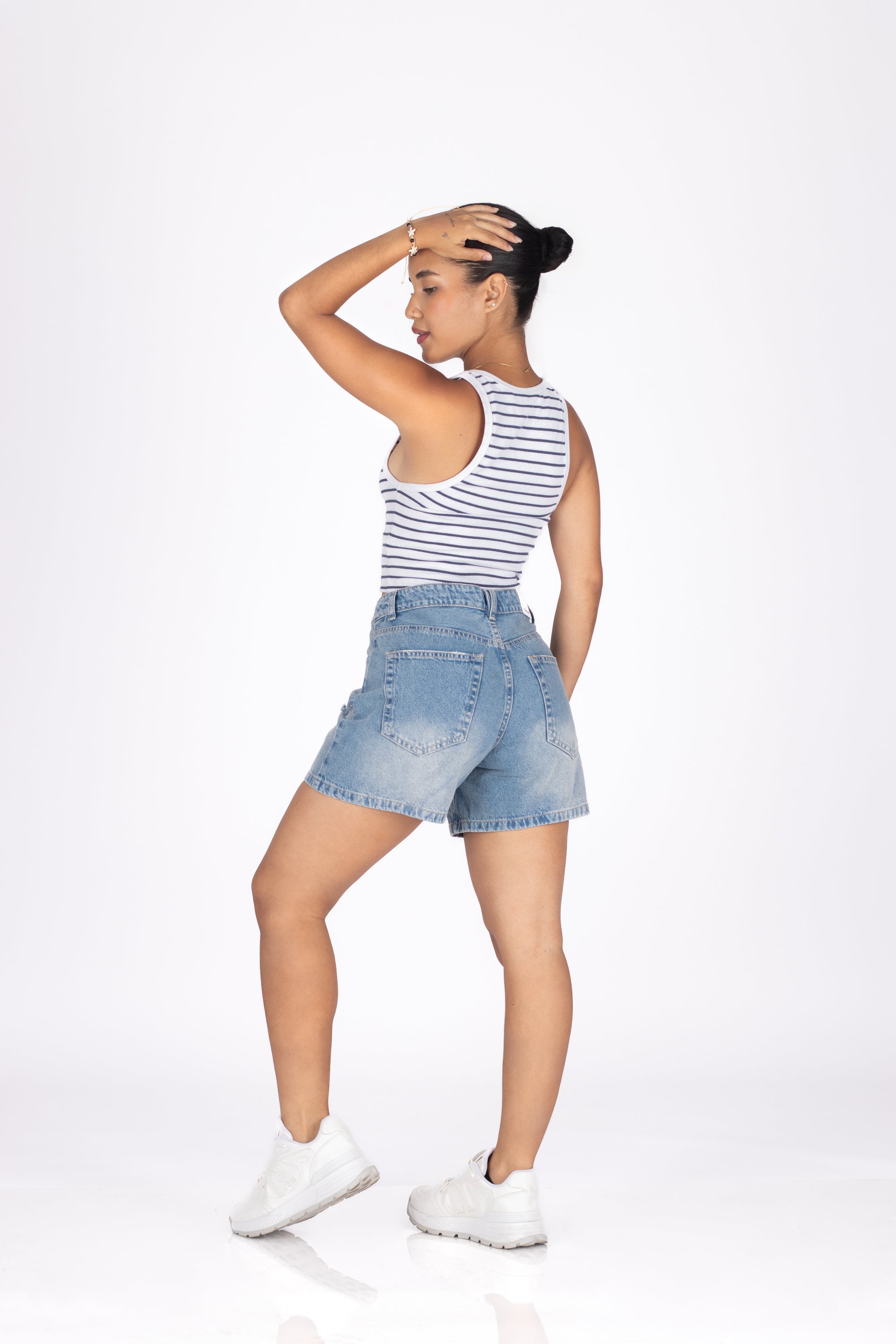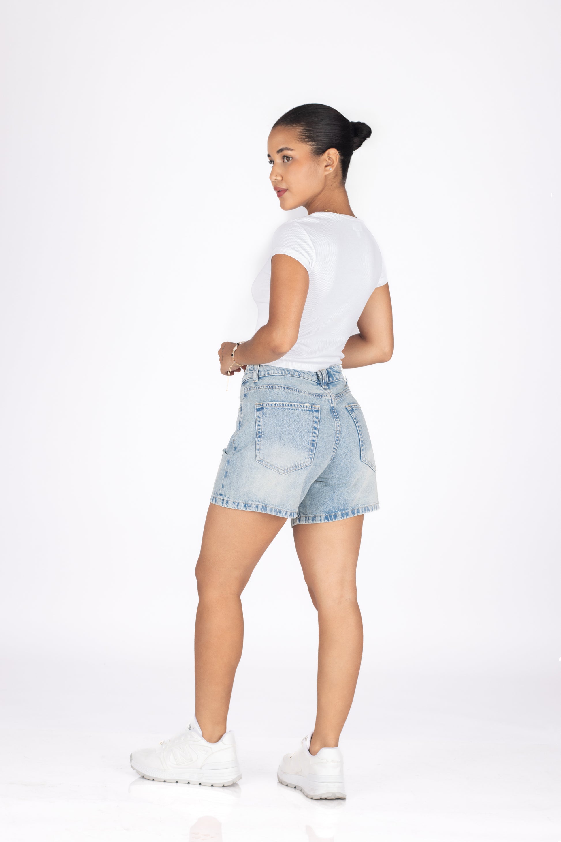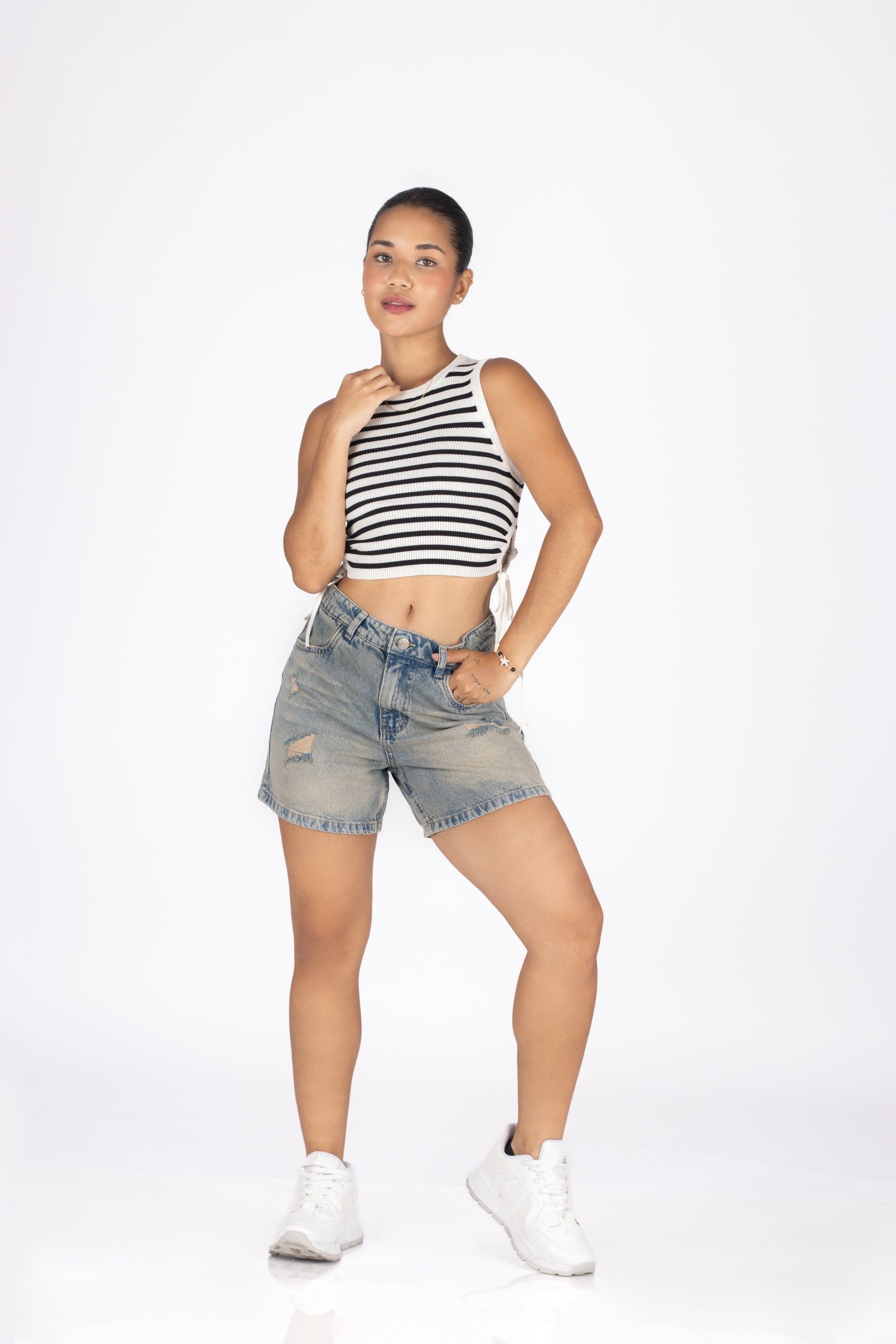 Denim rígido con pequeños rasgados, de tiro medio, con bolsillos delanteros y traseros.