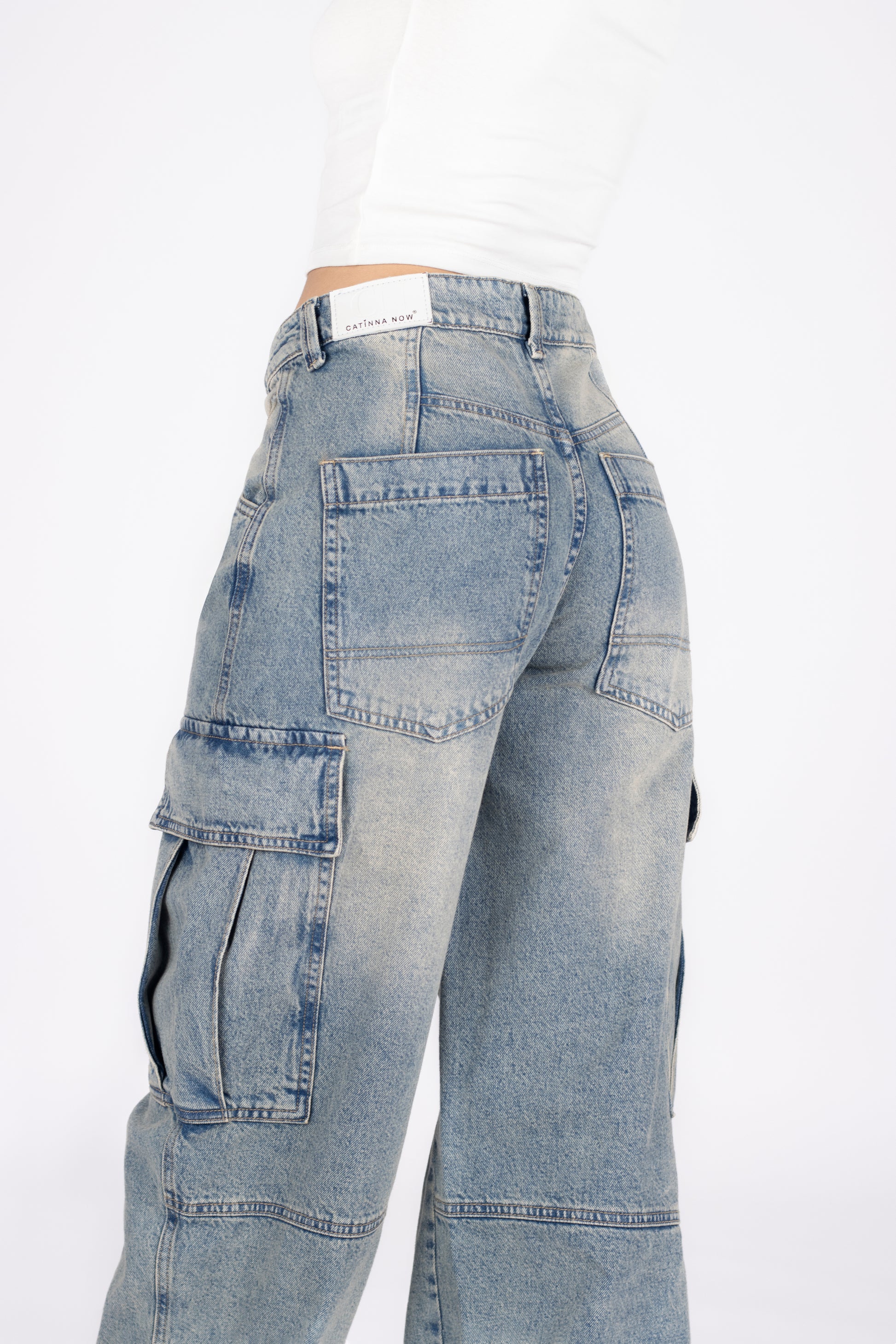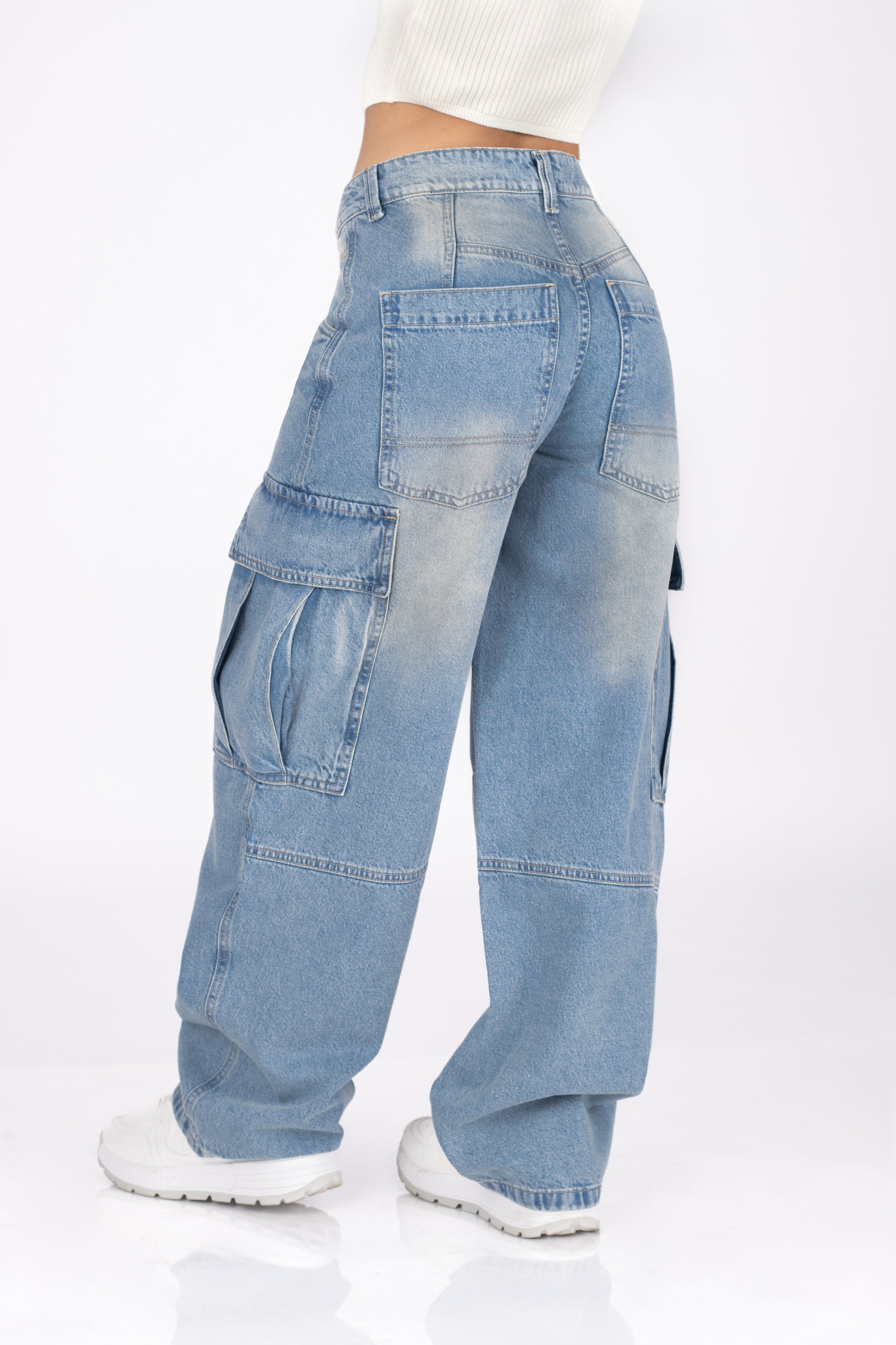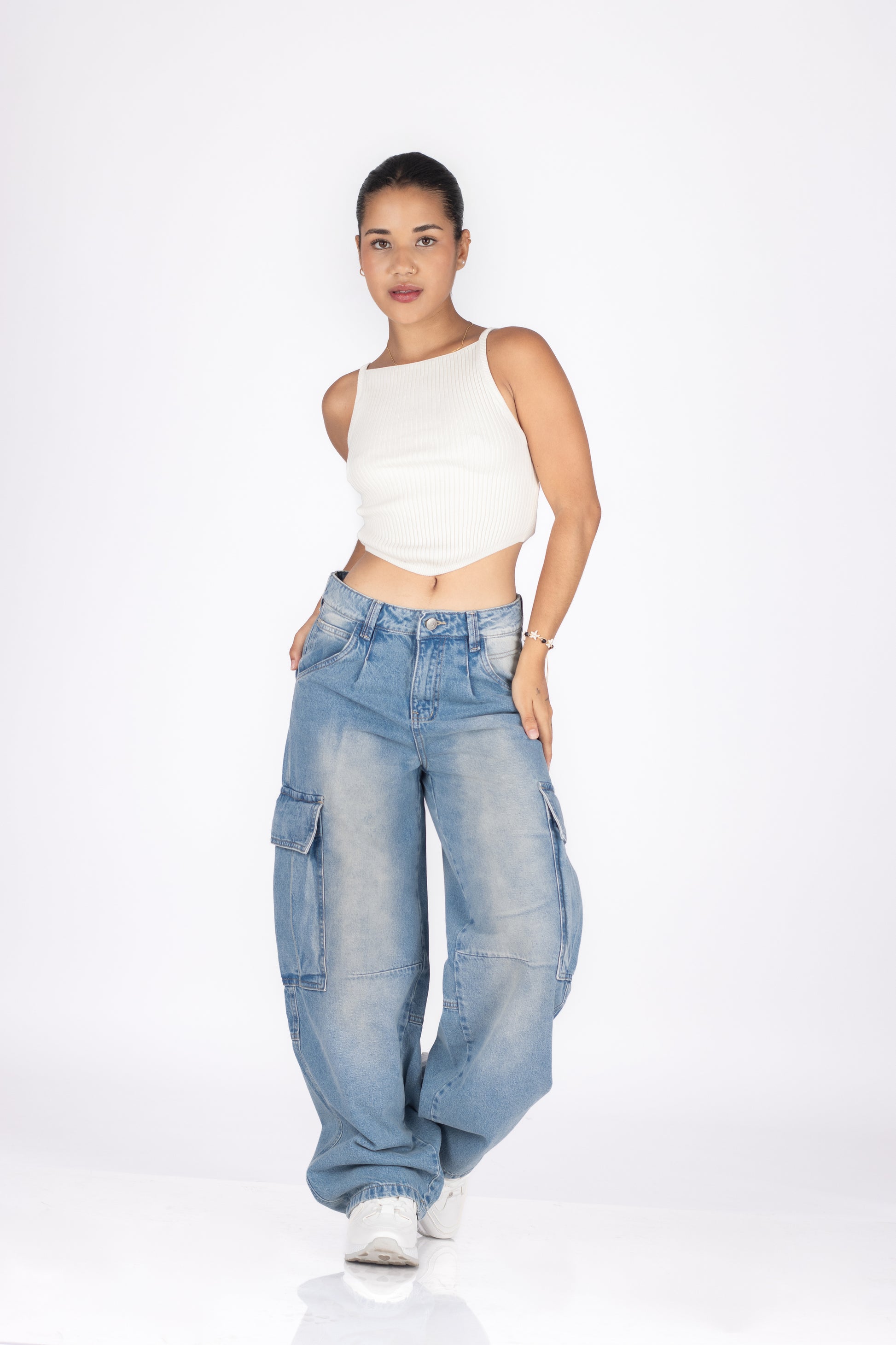 Denim rígido, de tiro medio con 2 bolsillos en cada pierna, con varios detalles en la parte trasera y delantera.