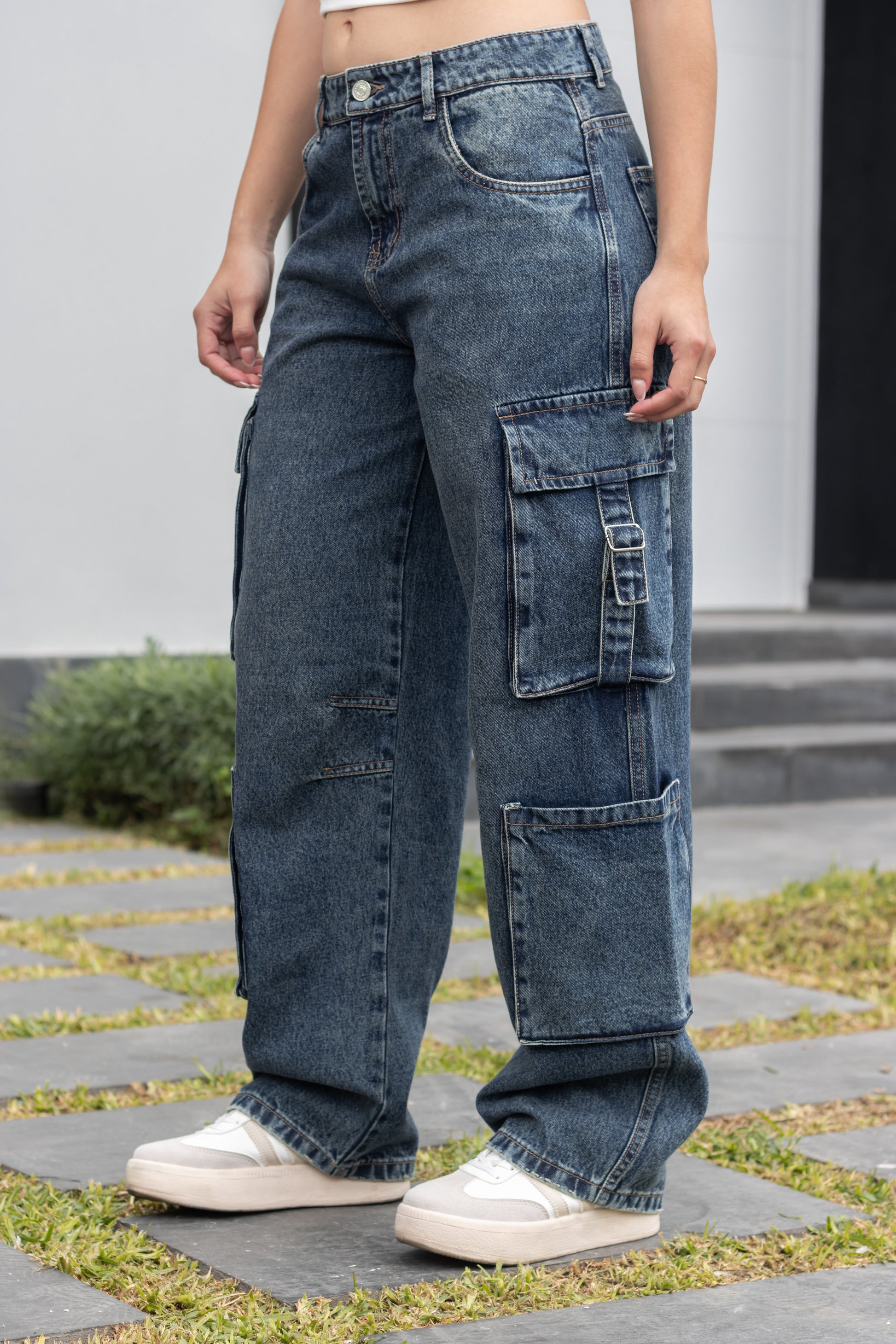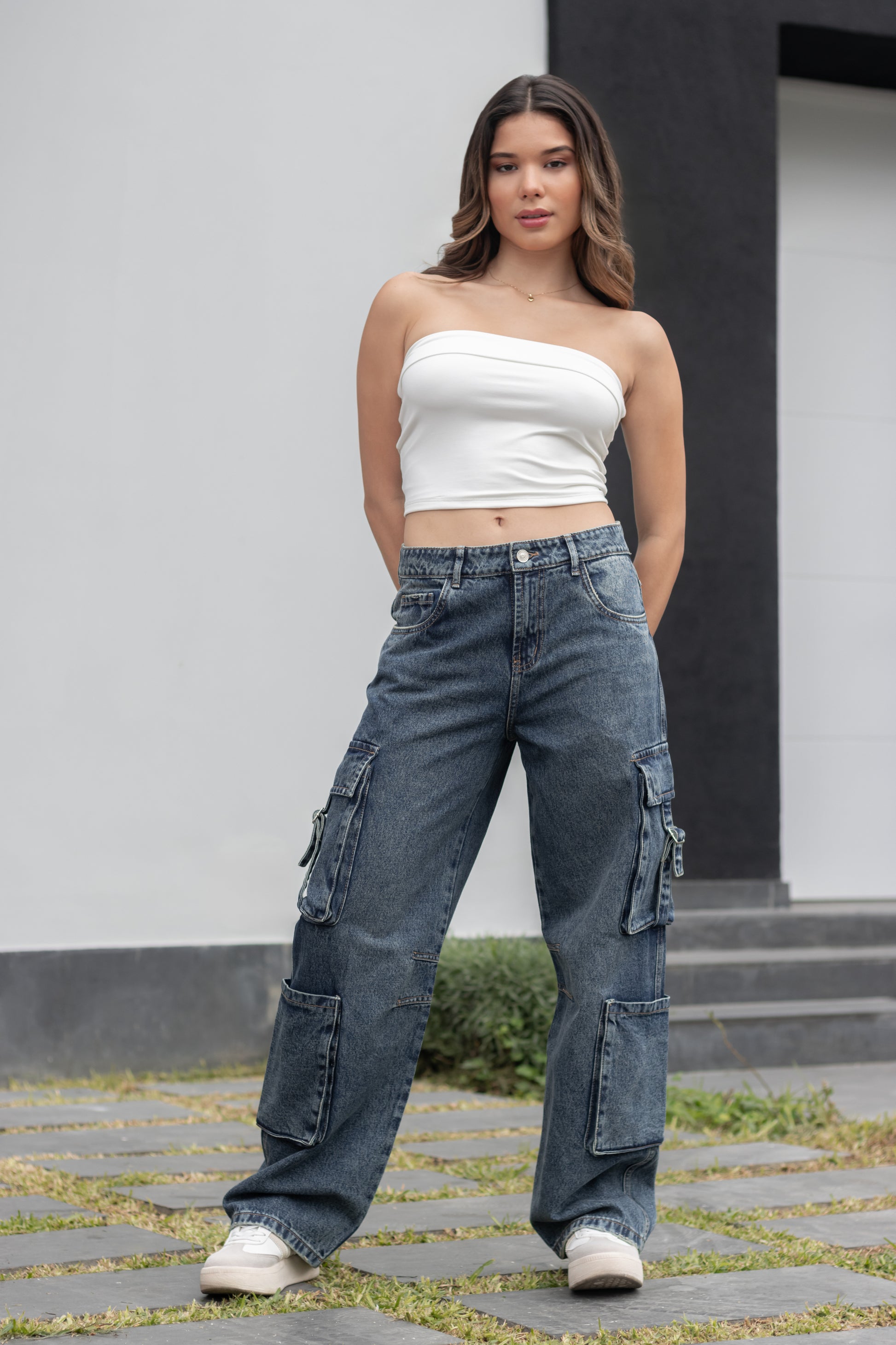 Denim rígido, de tiro medio, con bolsillos en la parte lateral derecha e izquierda.