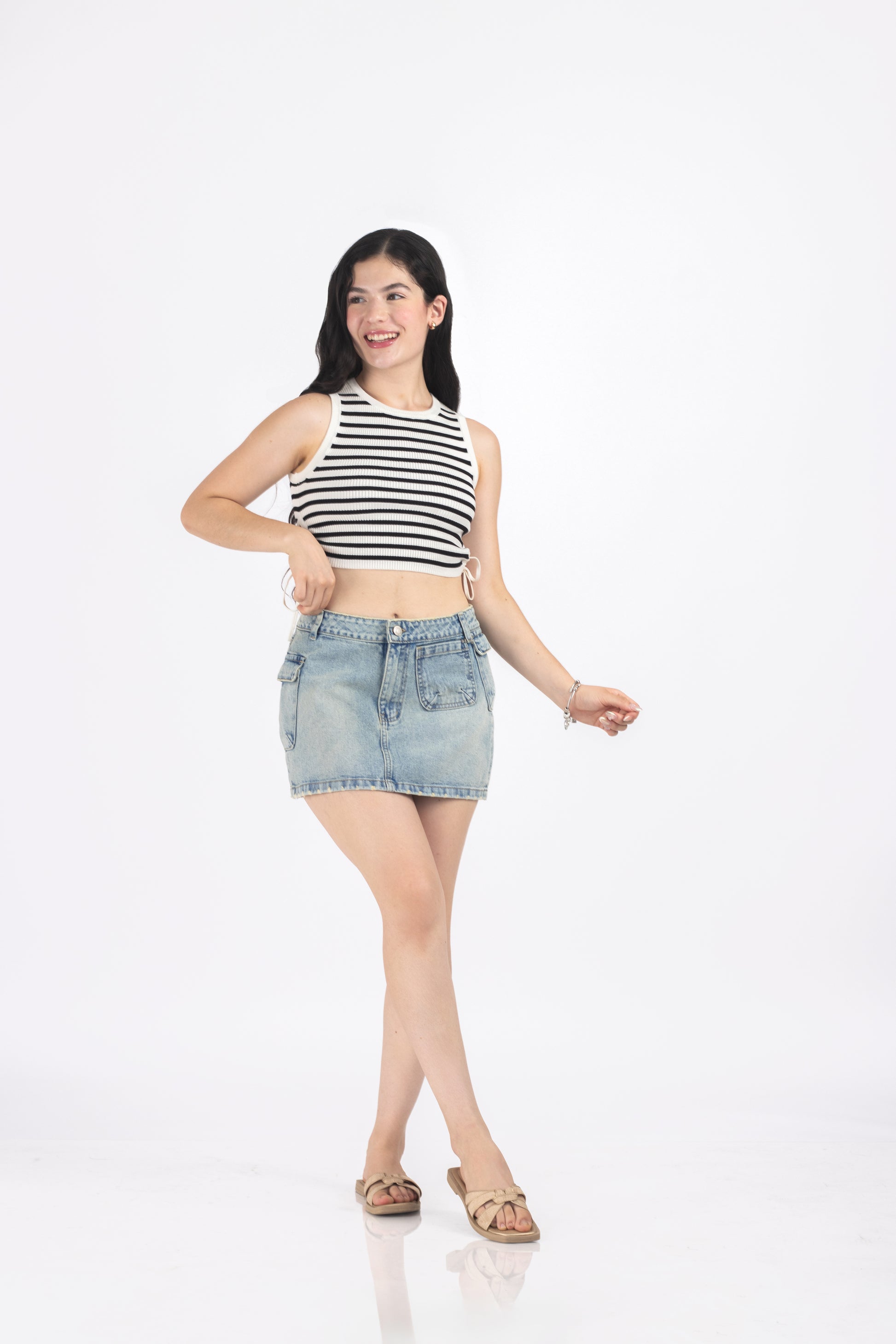 Denim rígido, de tiro medio y semi corto, con bolsillos.