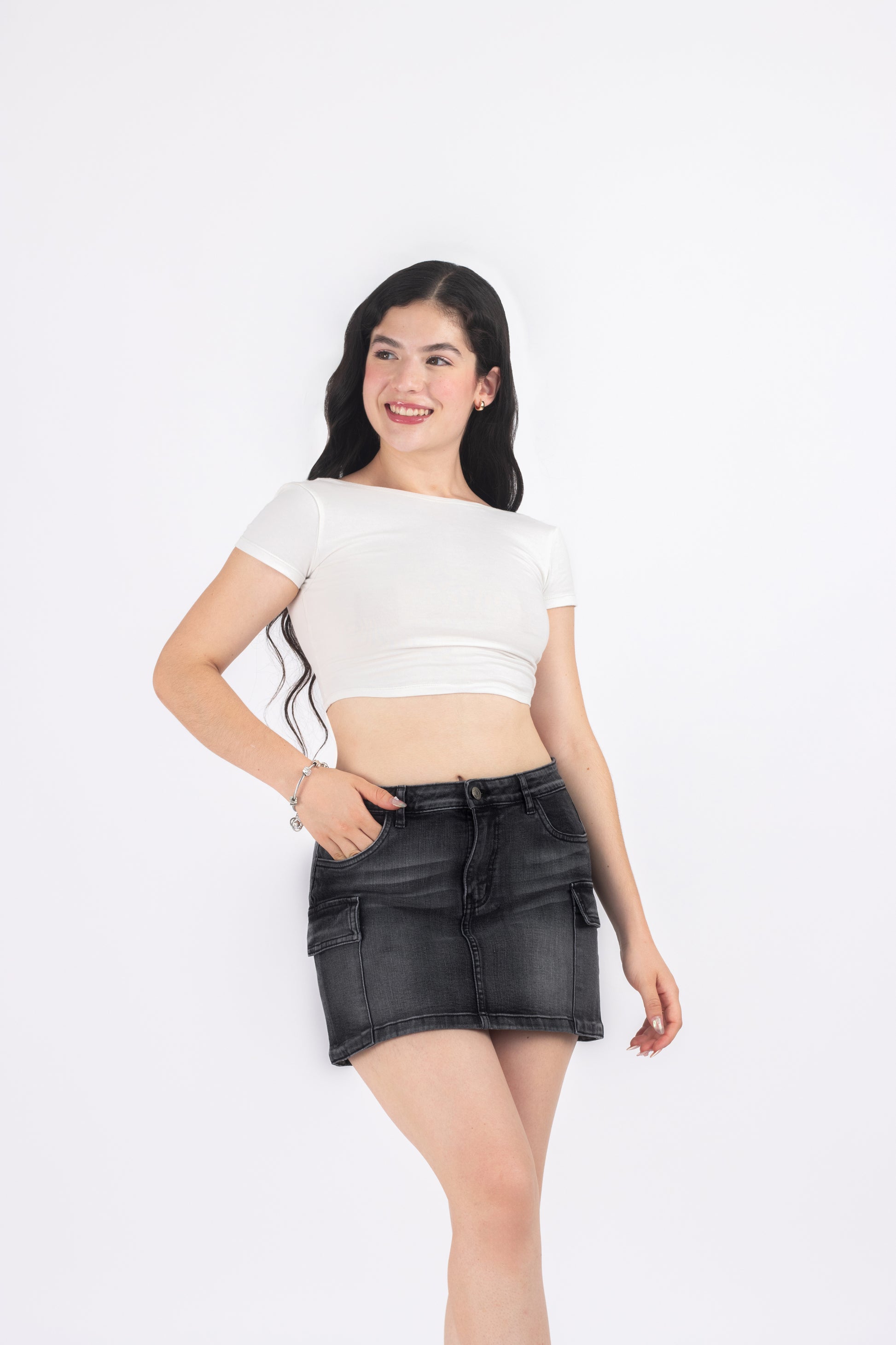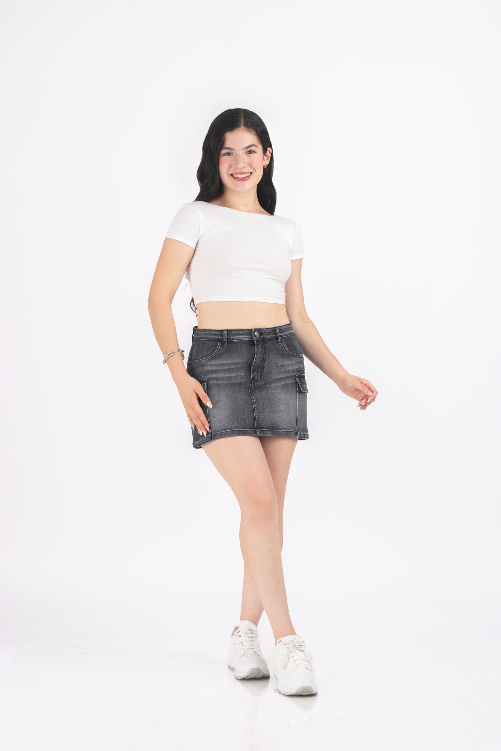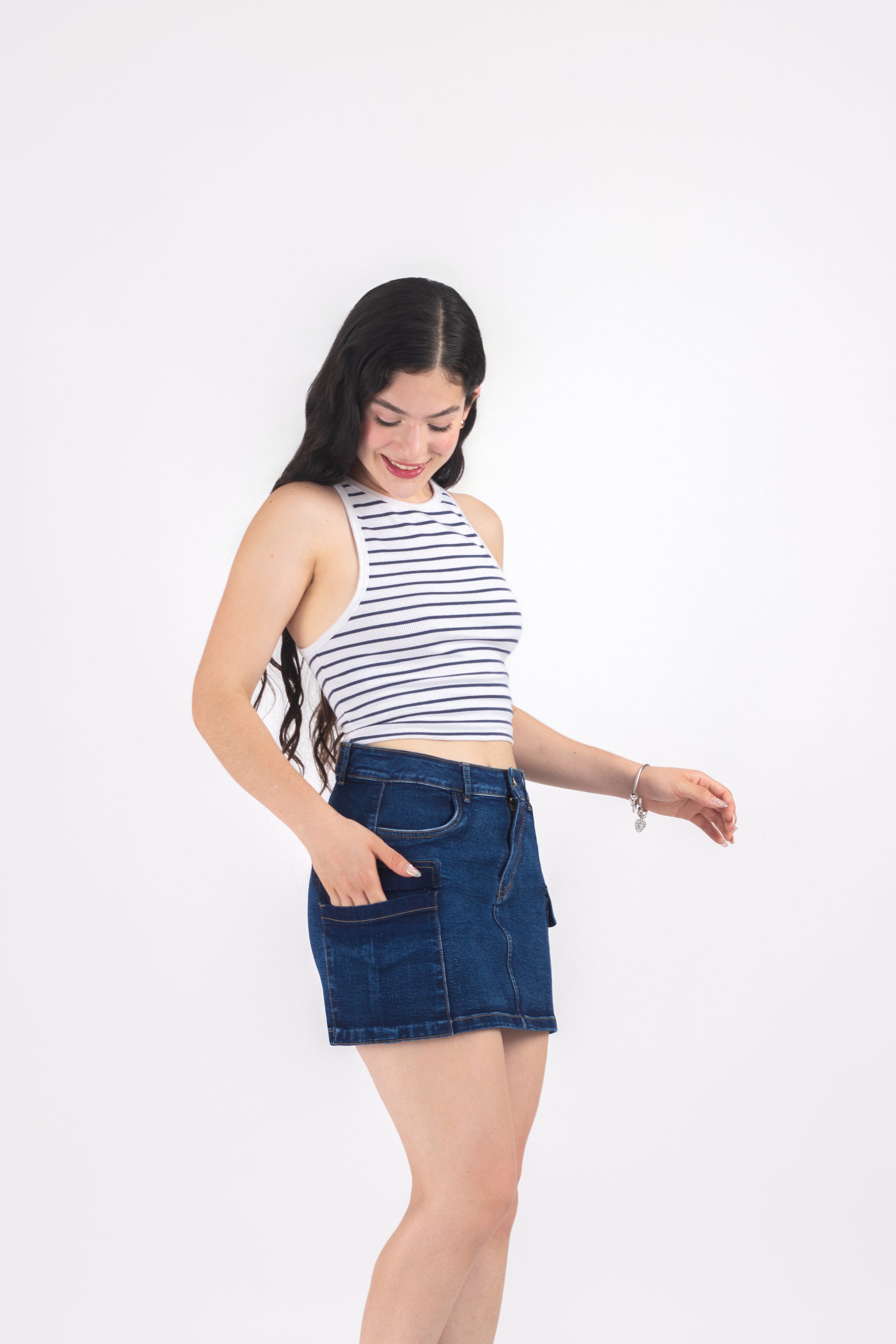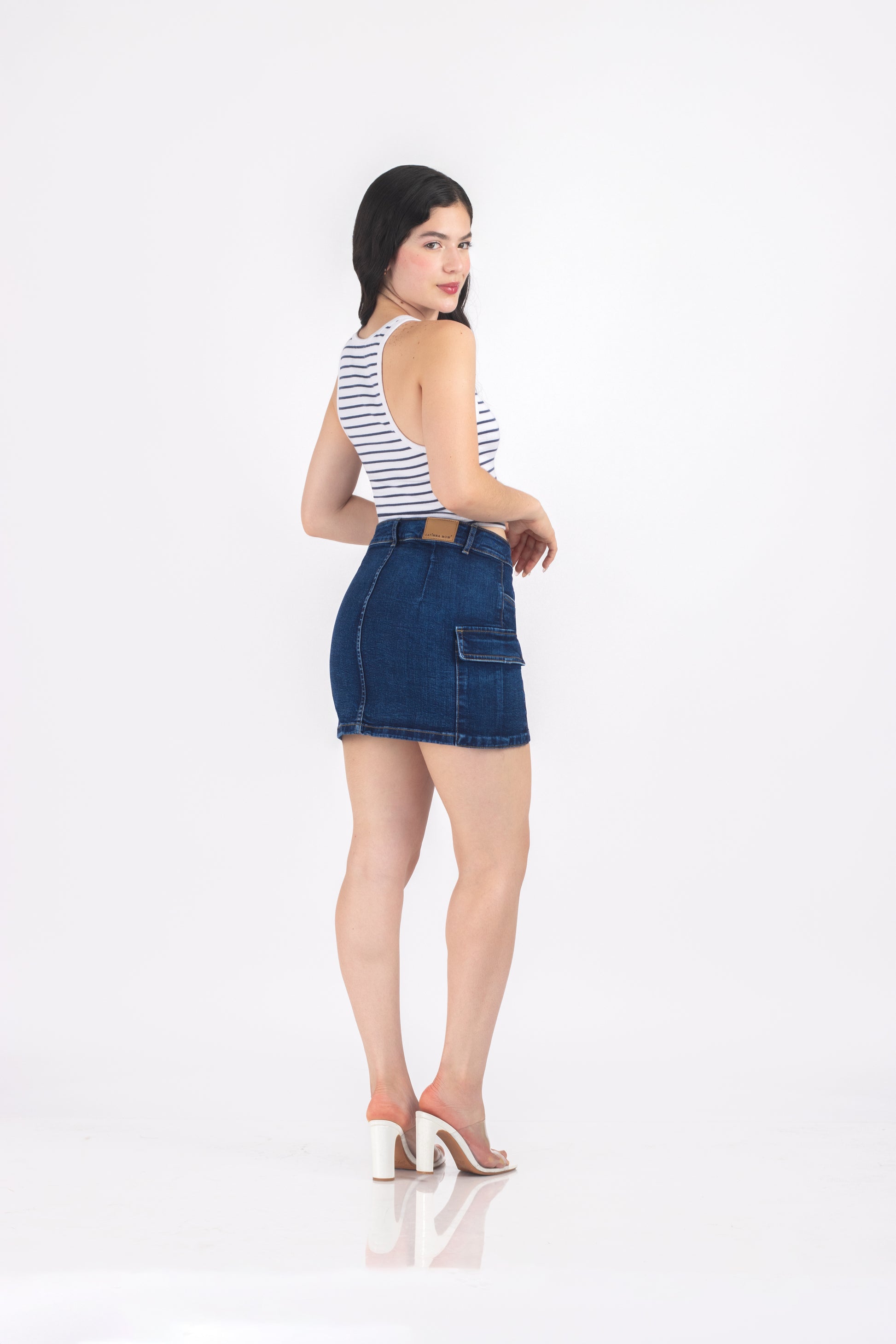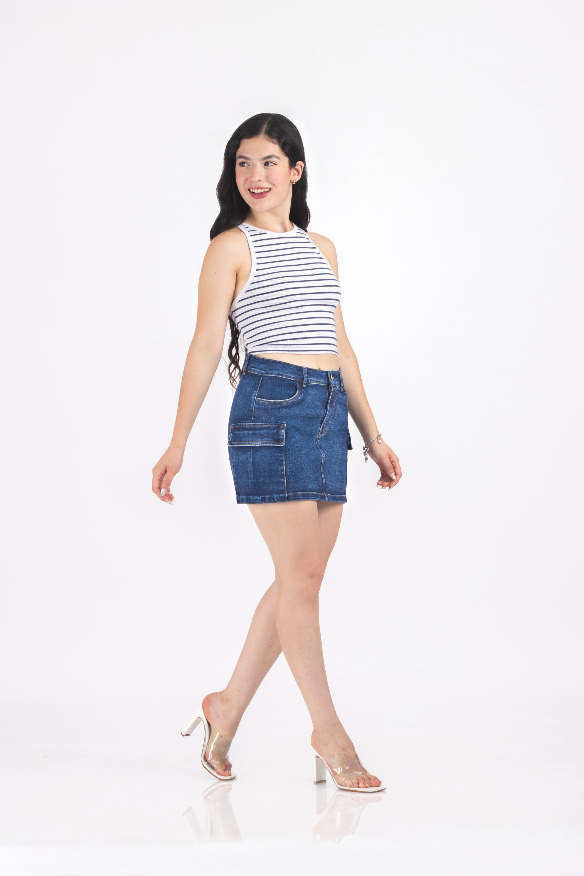 Denim stretch, con bolsillos laterales, de tiro alto.