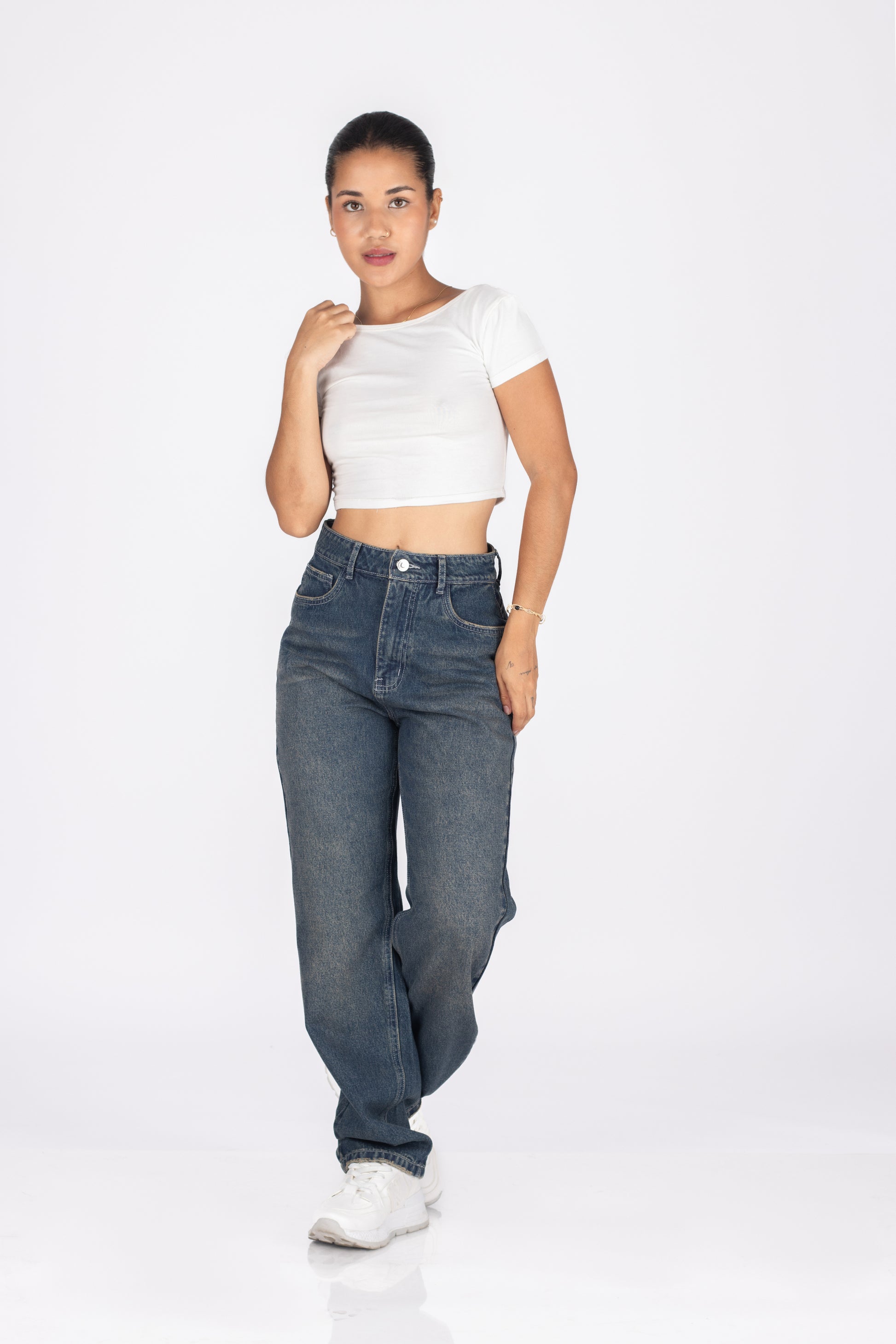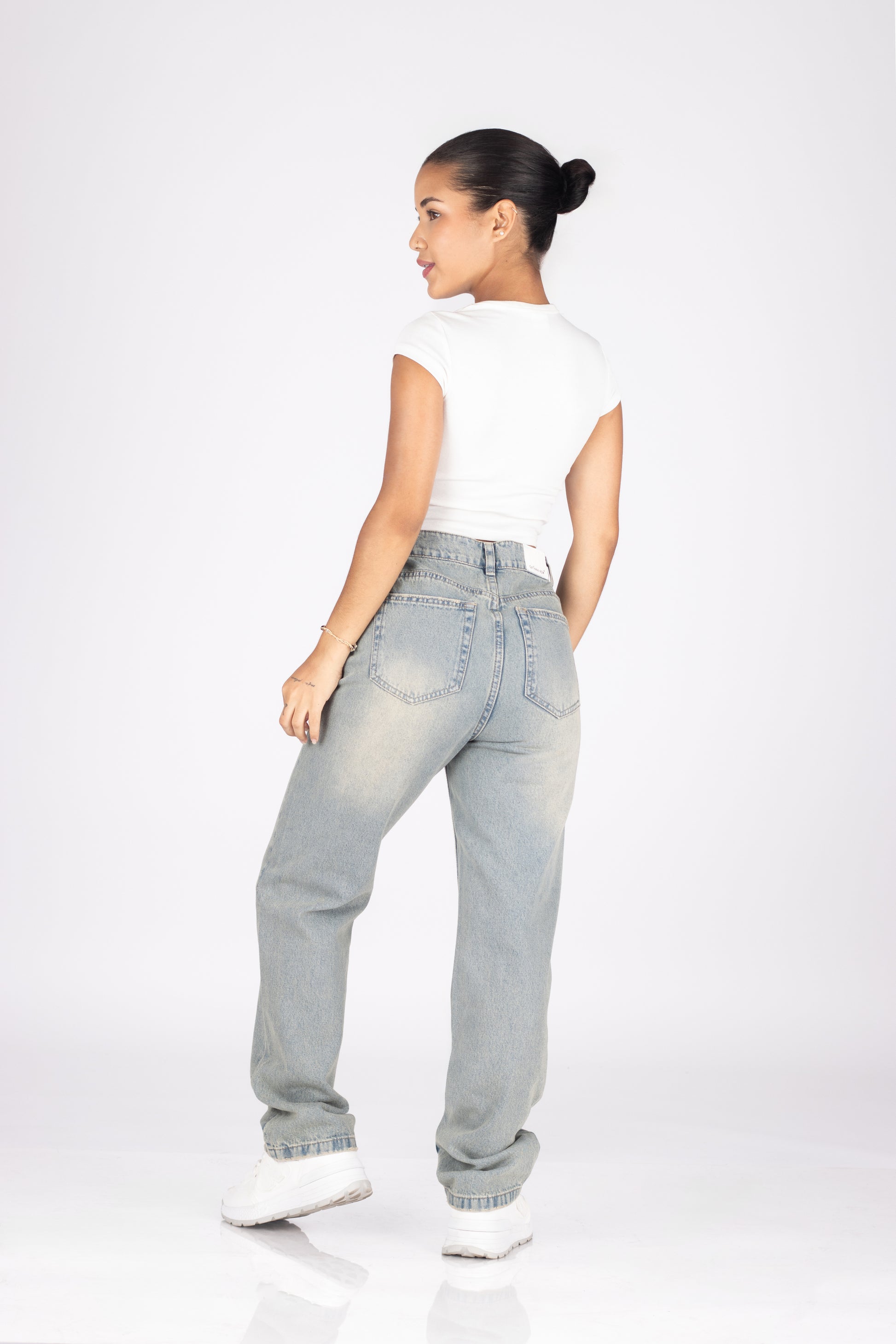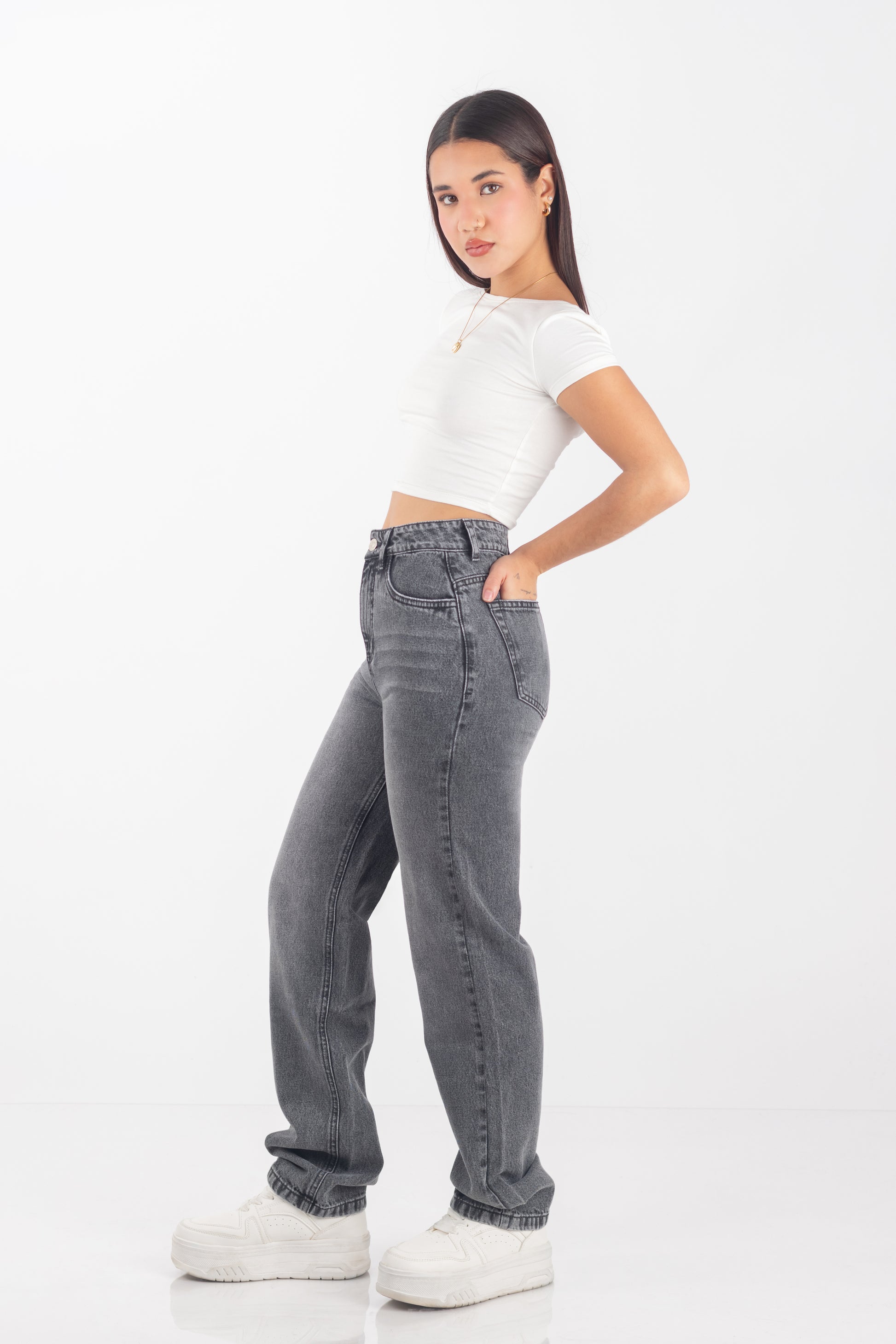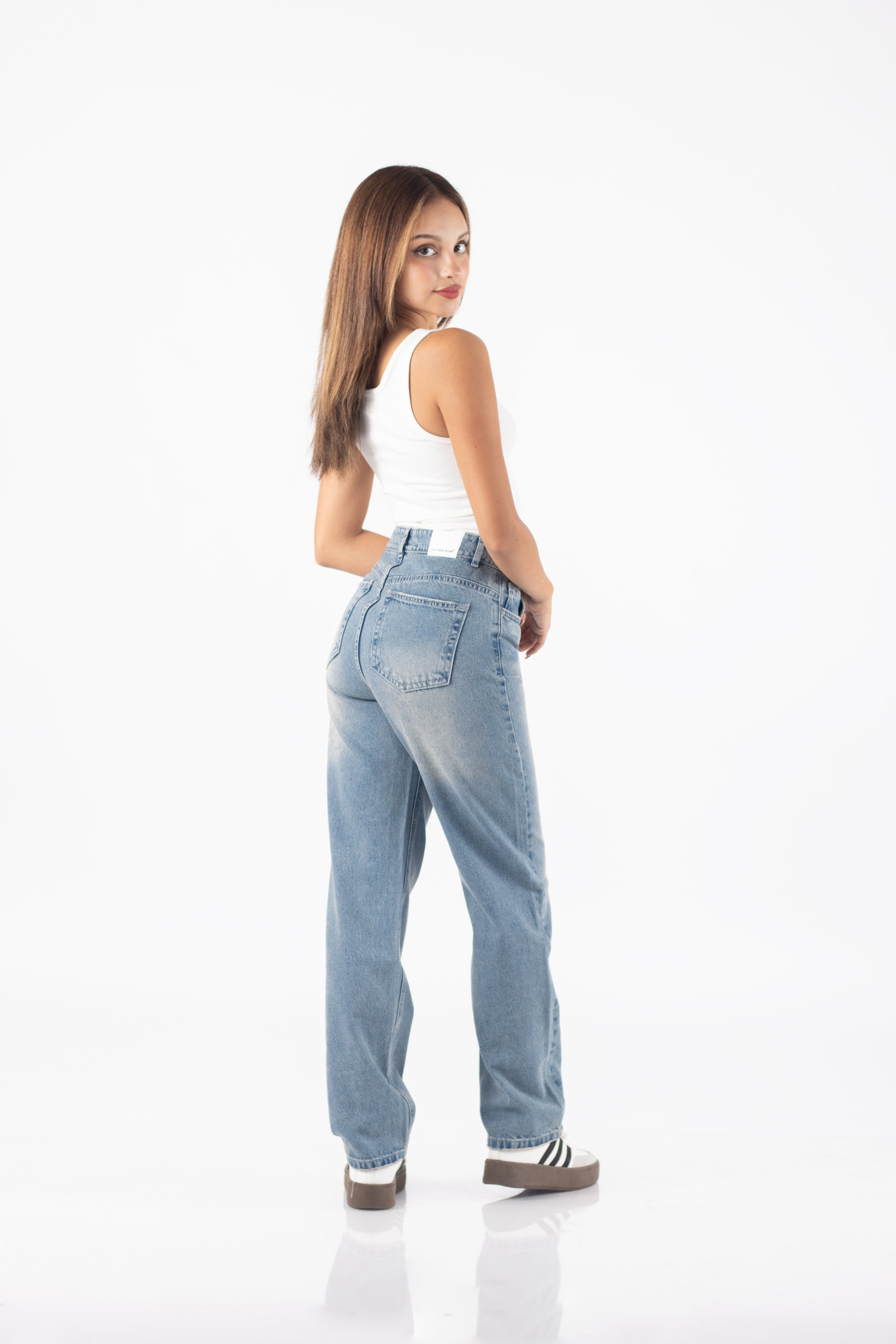 Denim rígido, con corte recto, caída holgada y tiro alto.