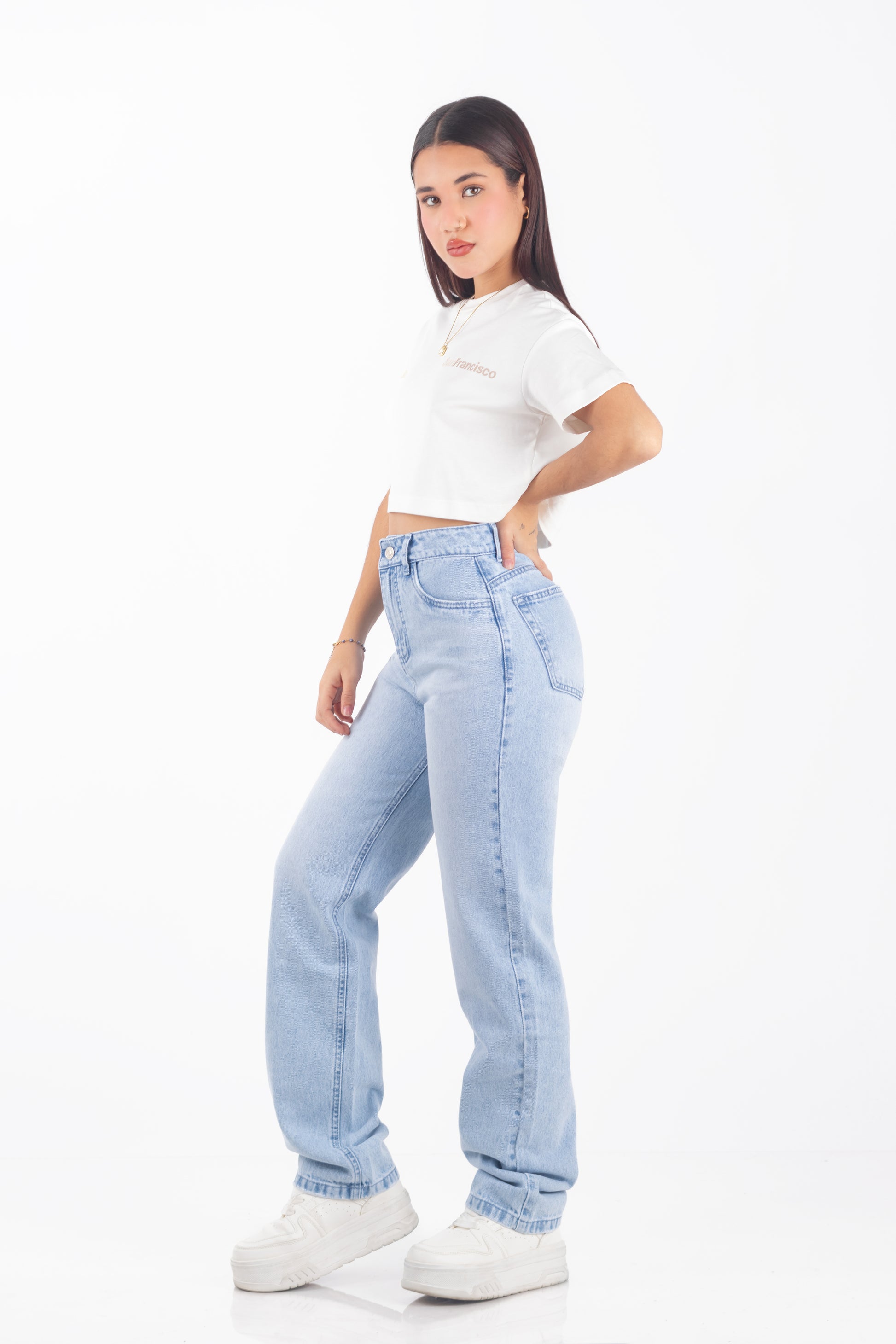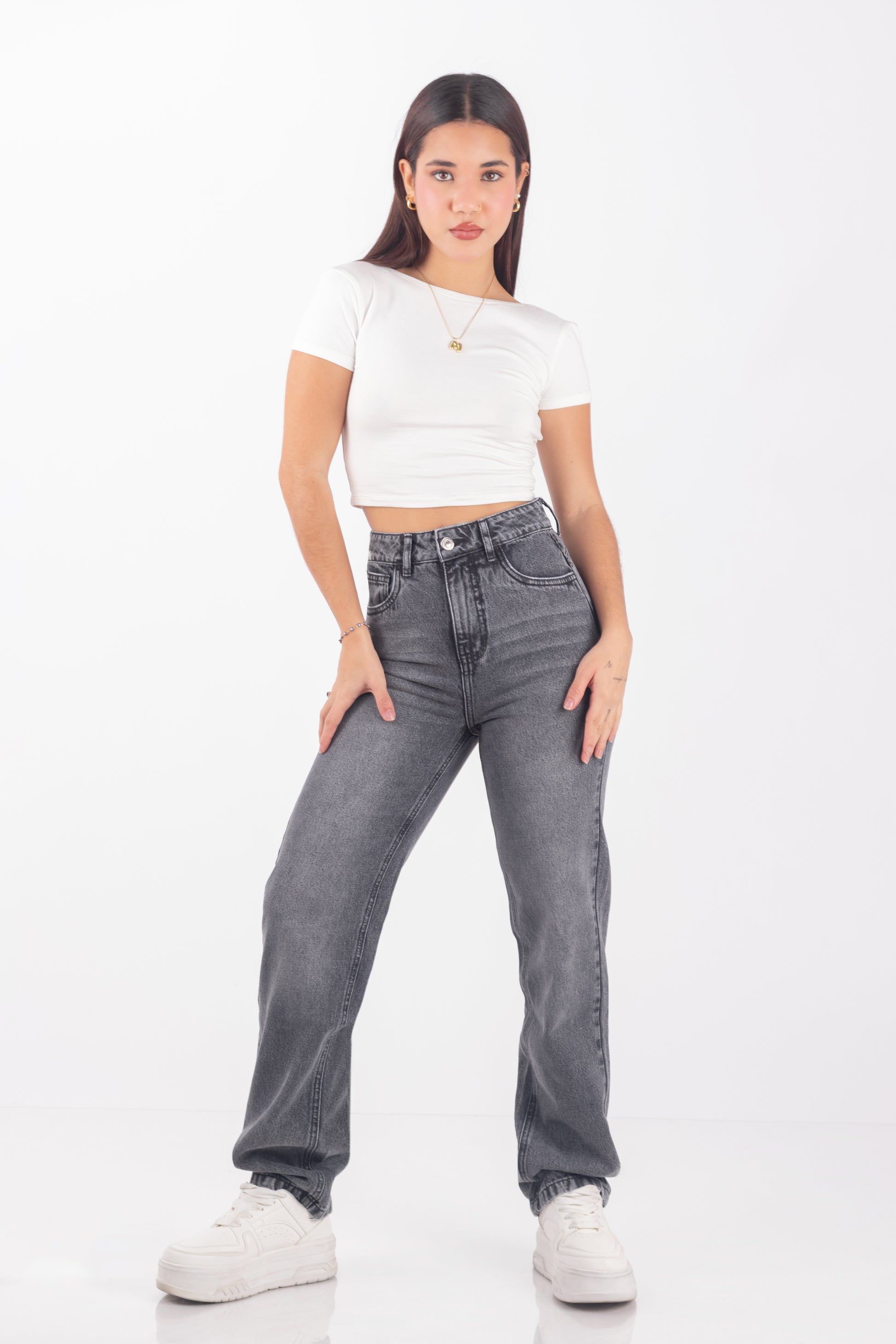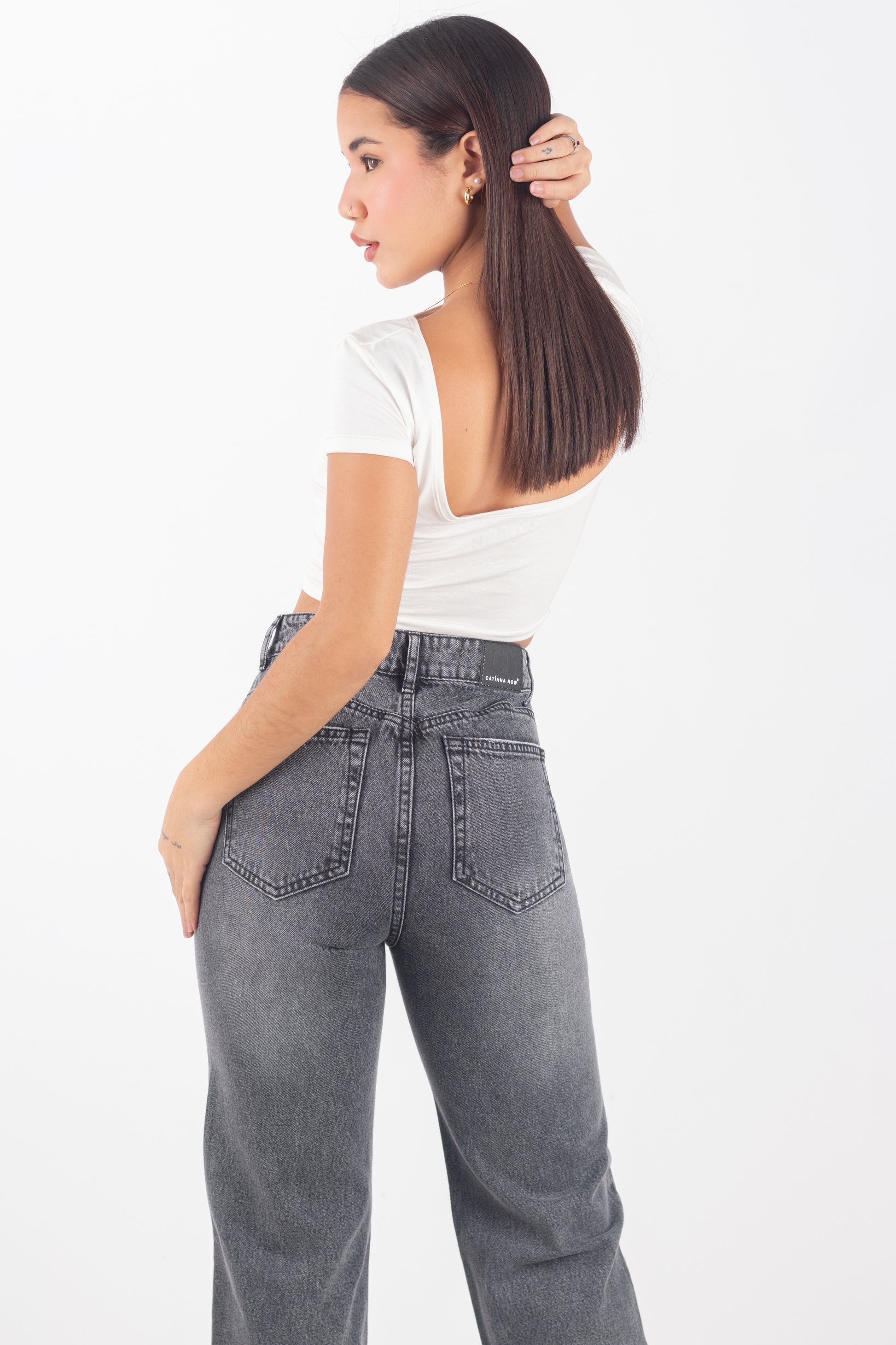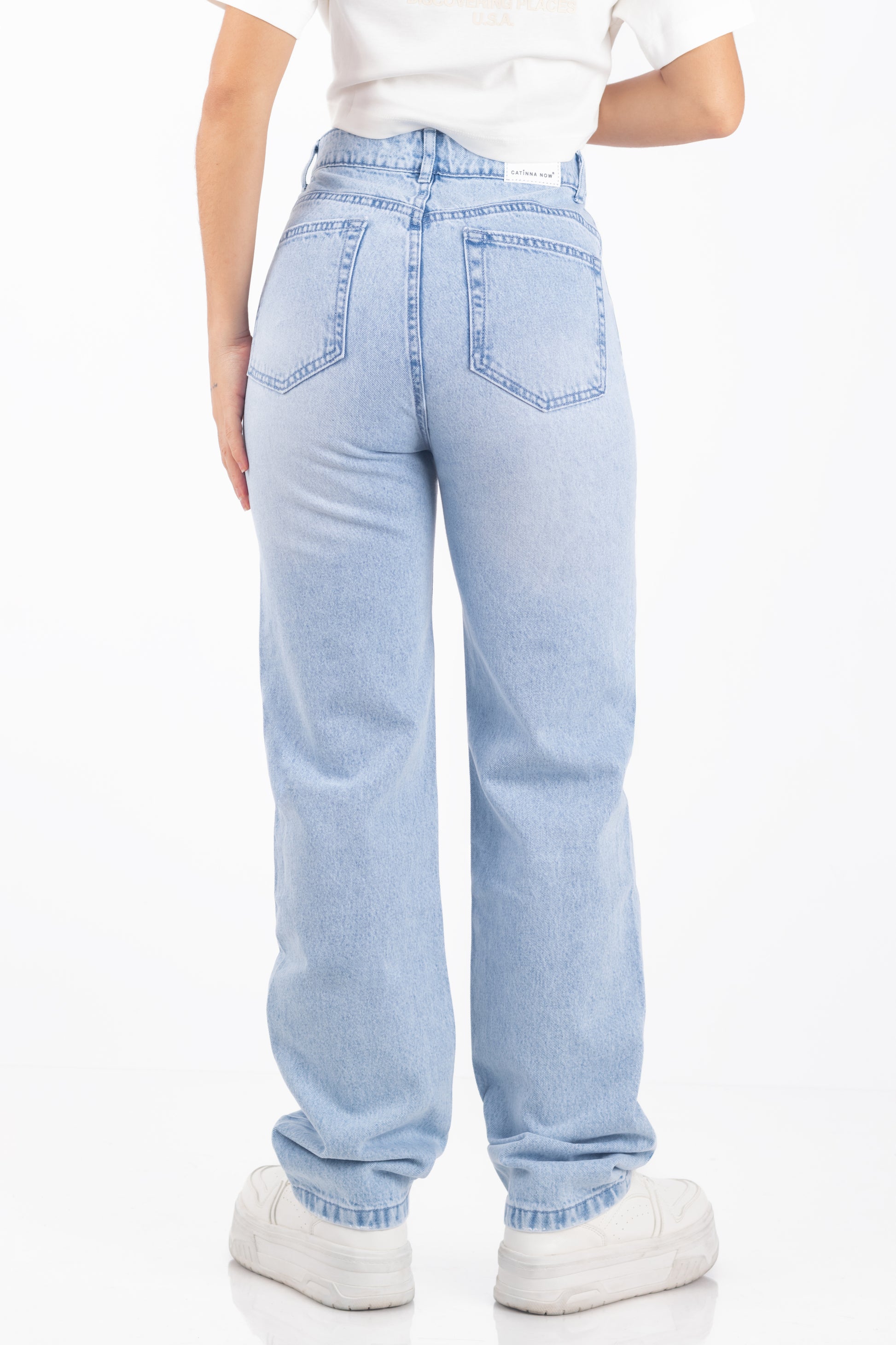 Denim rígido, con corte recto, caída holgada y tiro alto.