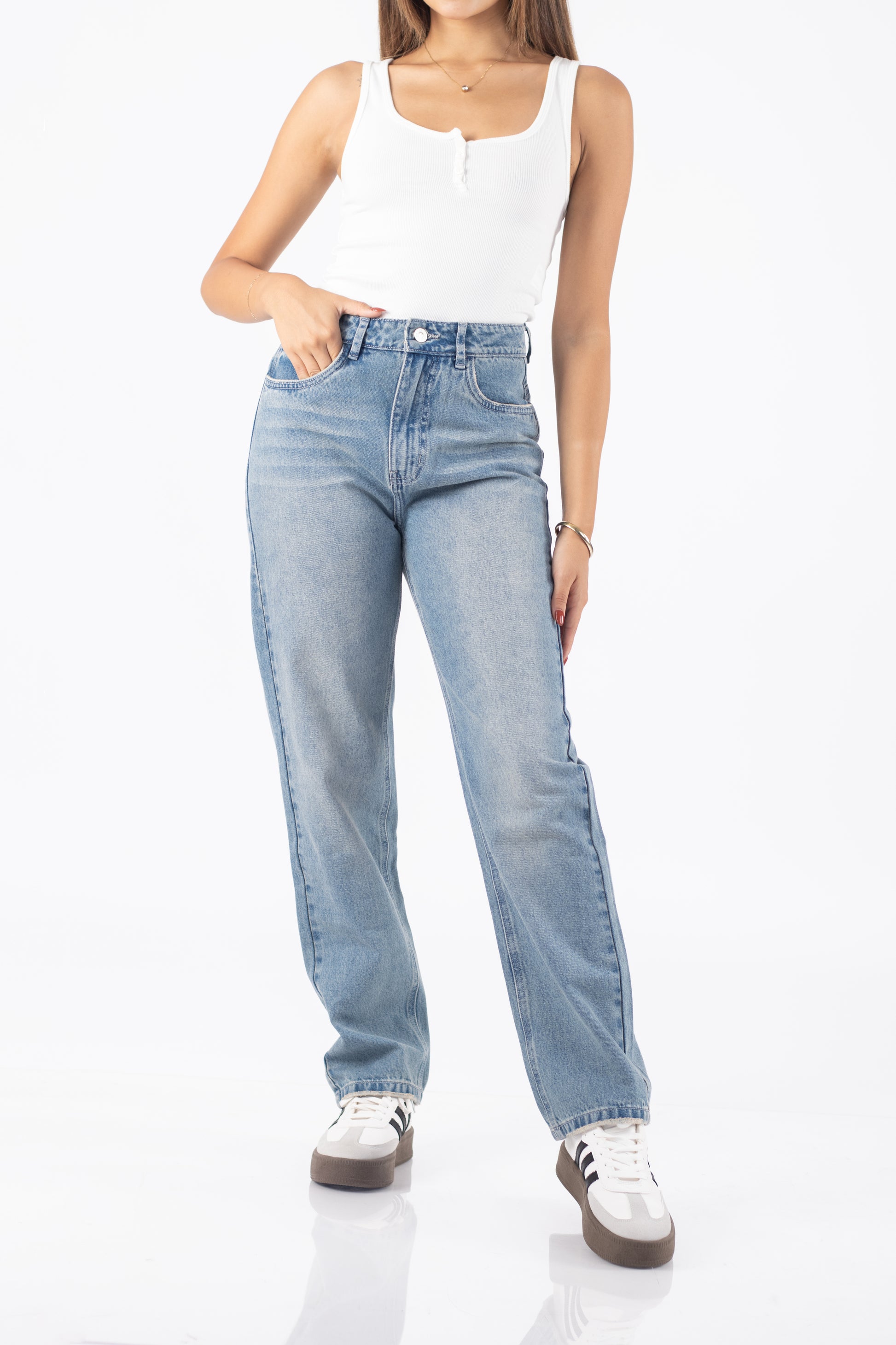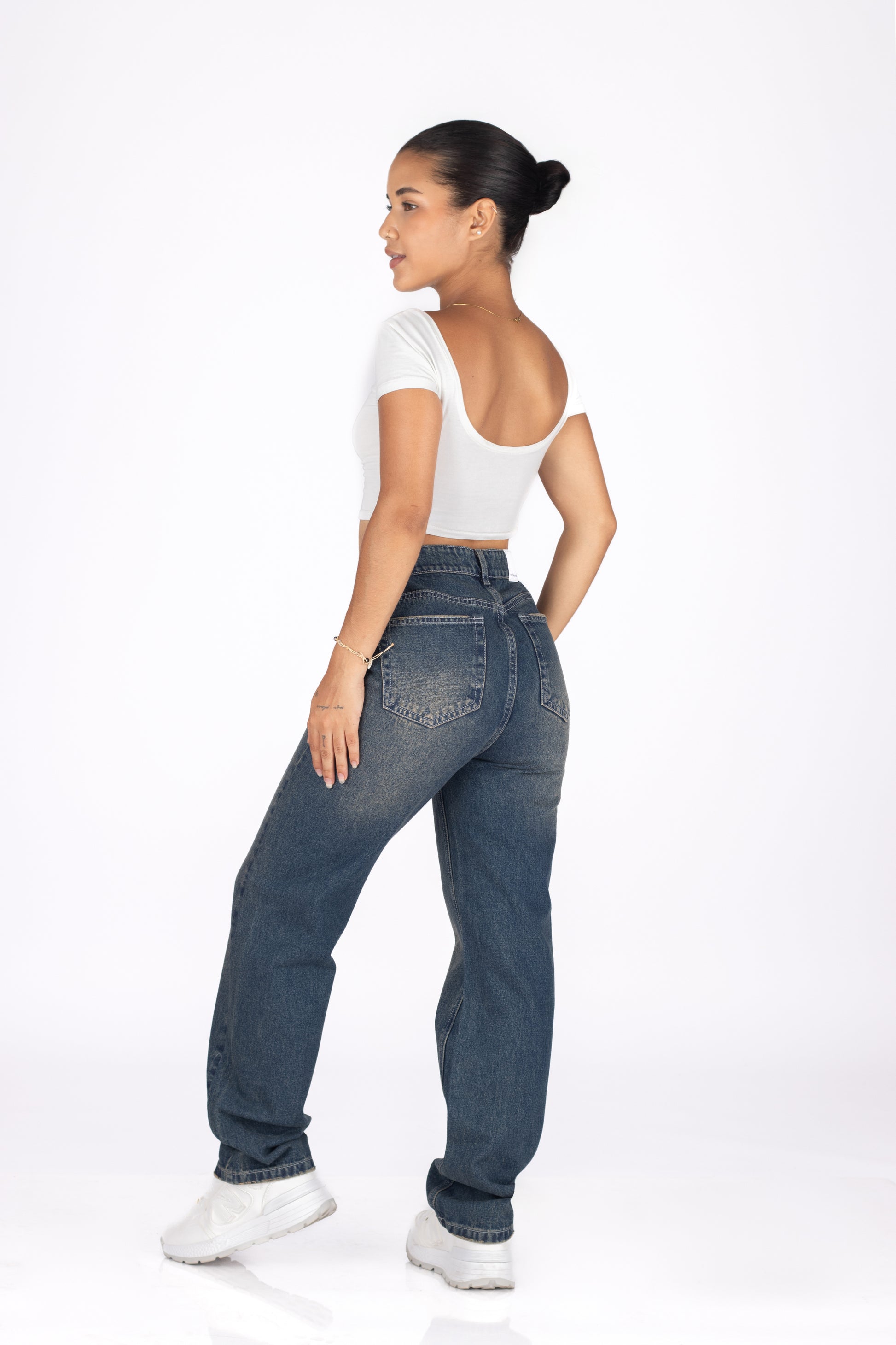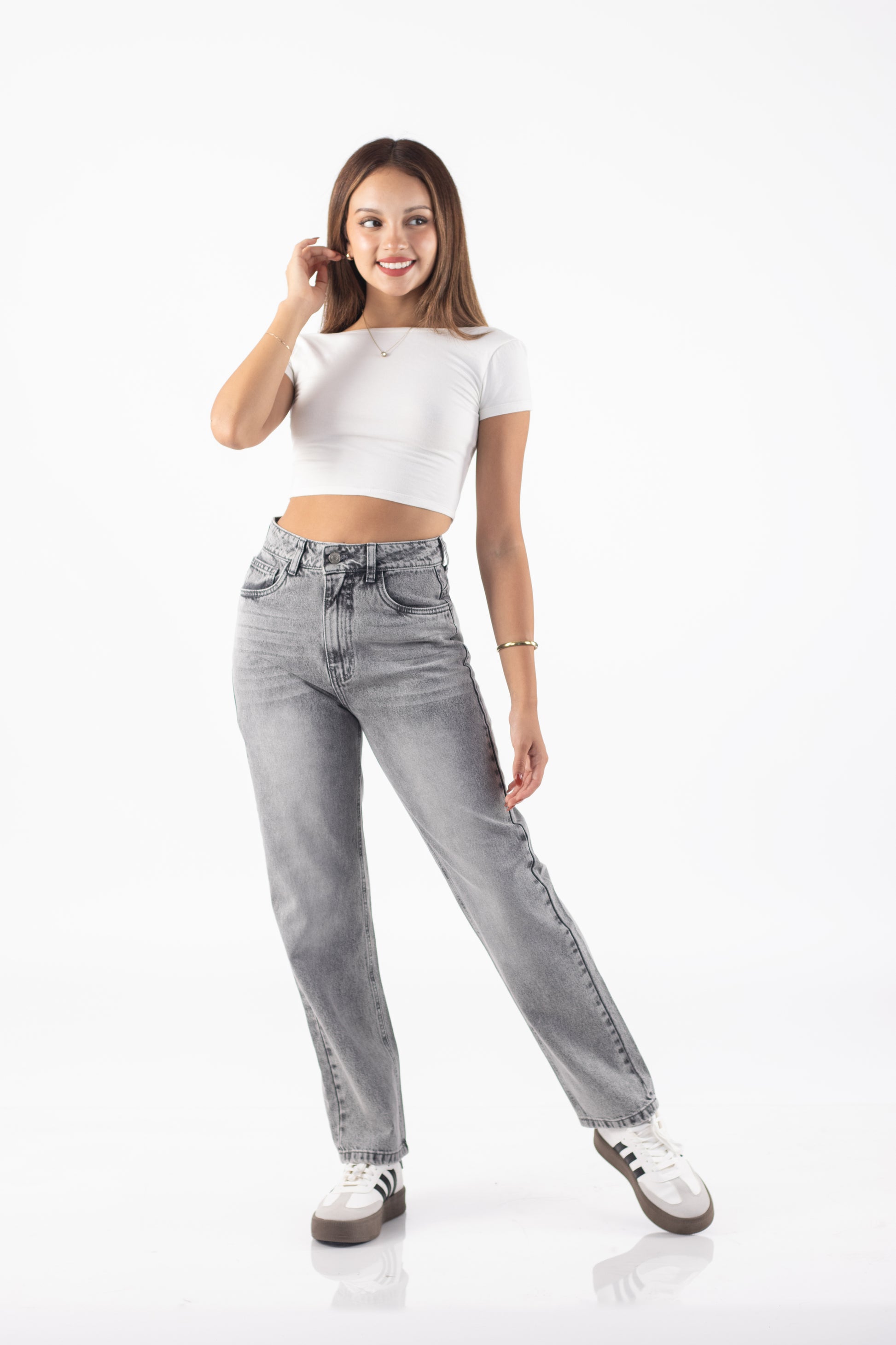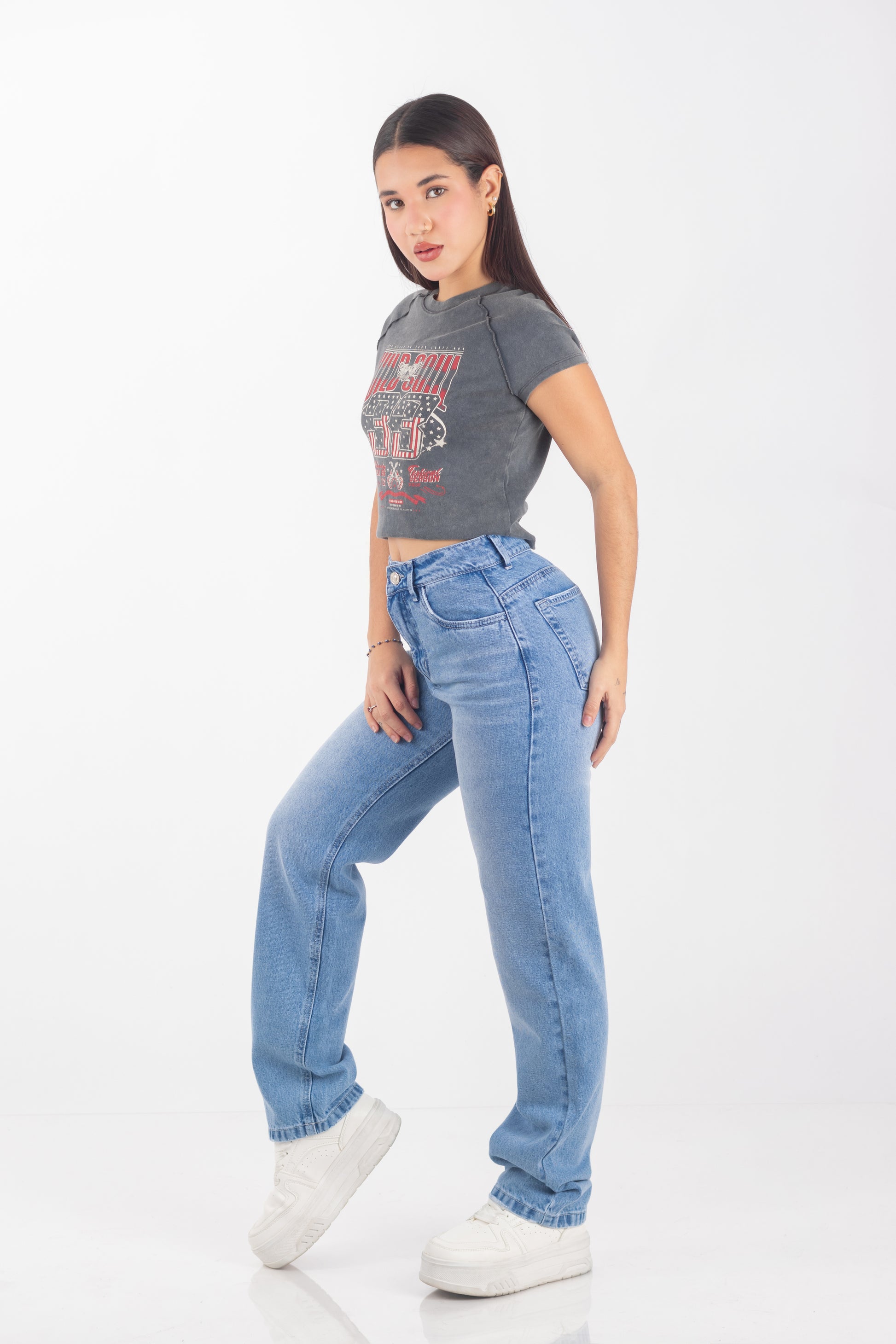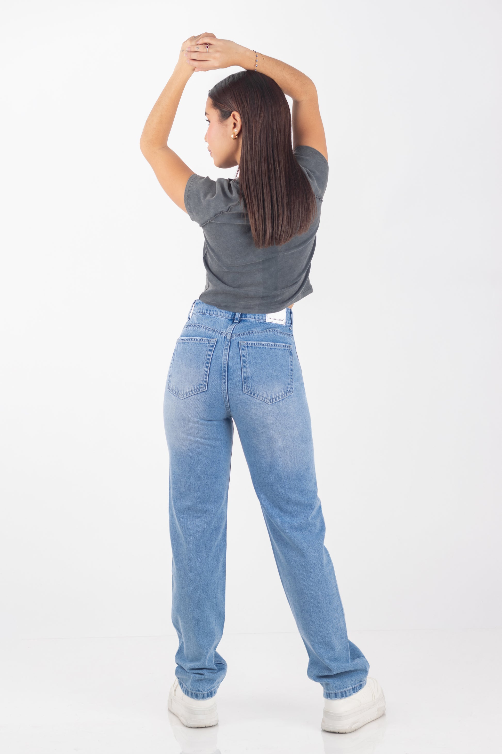 Denim rígido, con corte recto, caída holgada y tiro alto.
