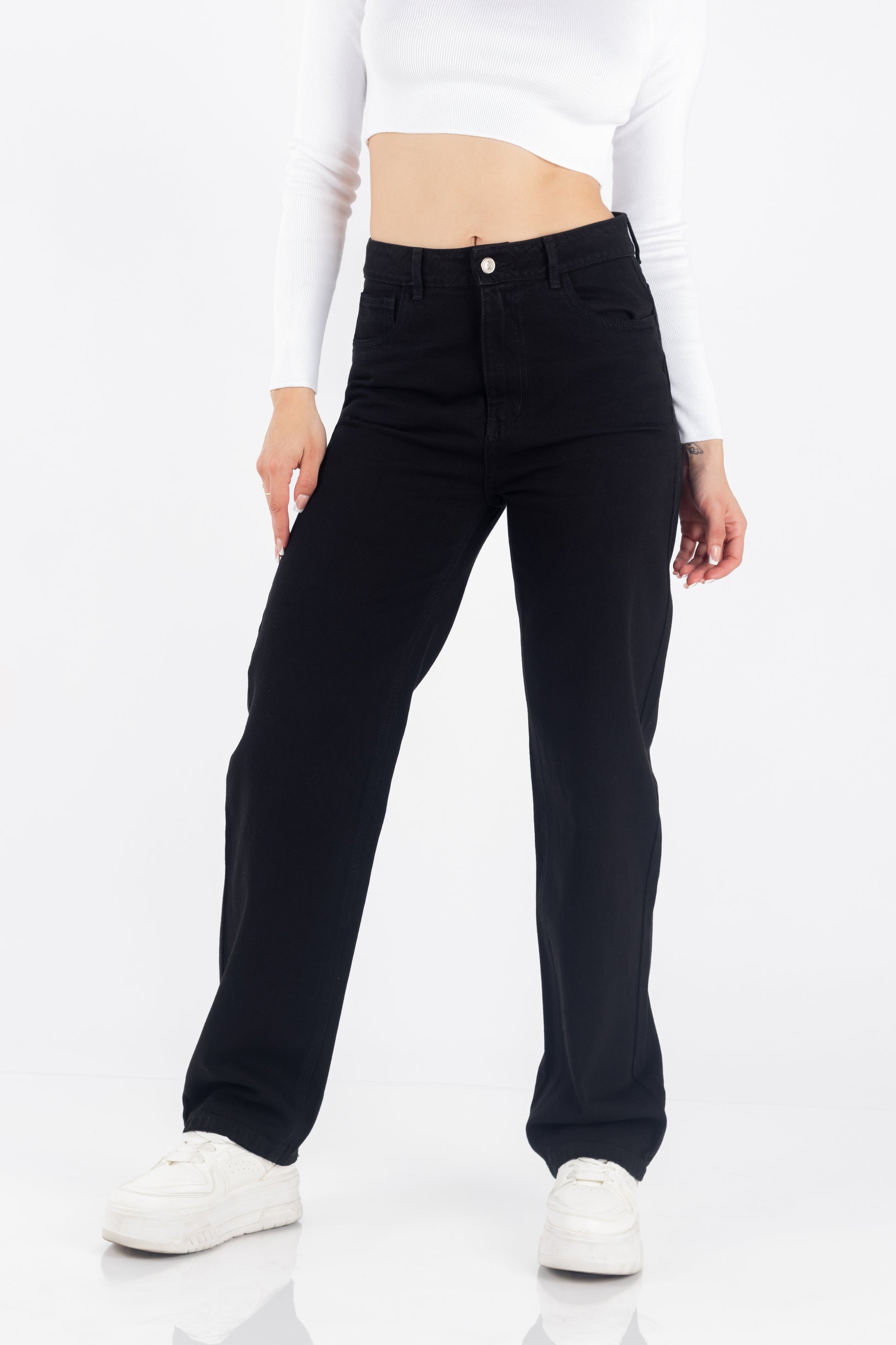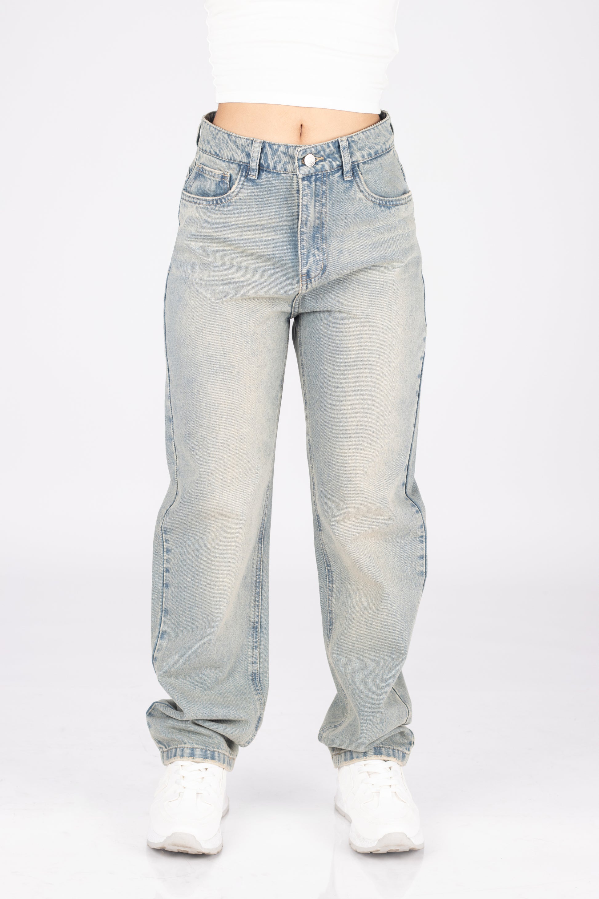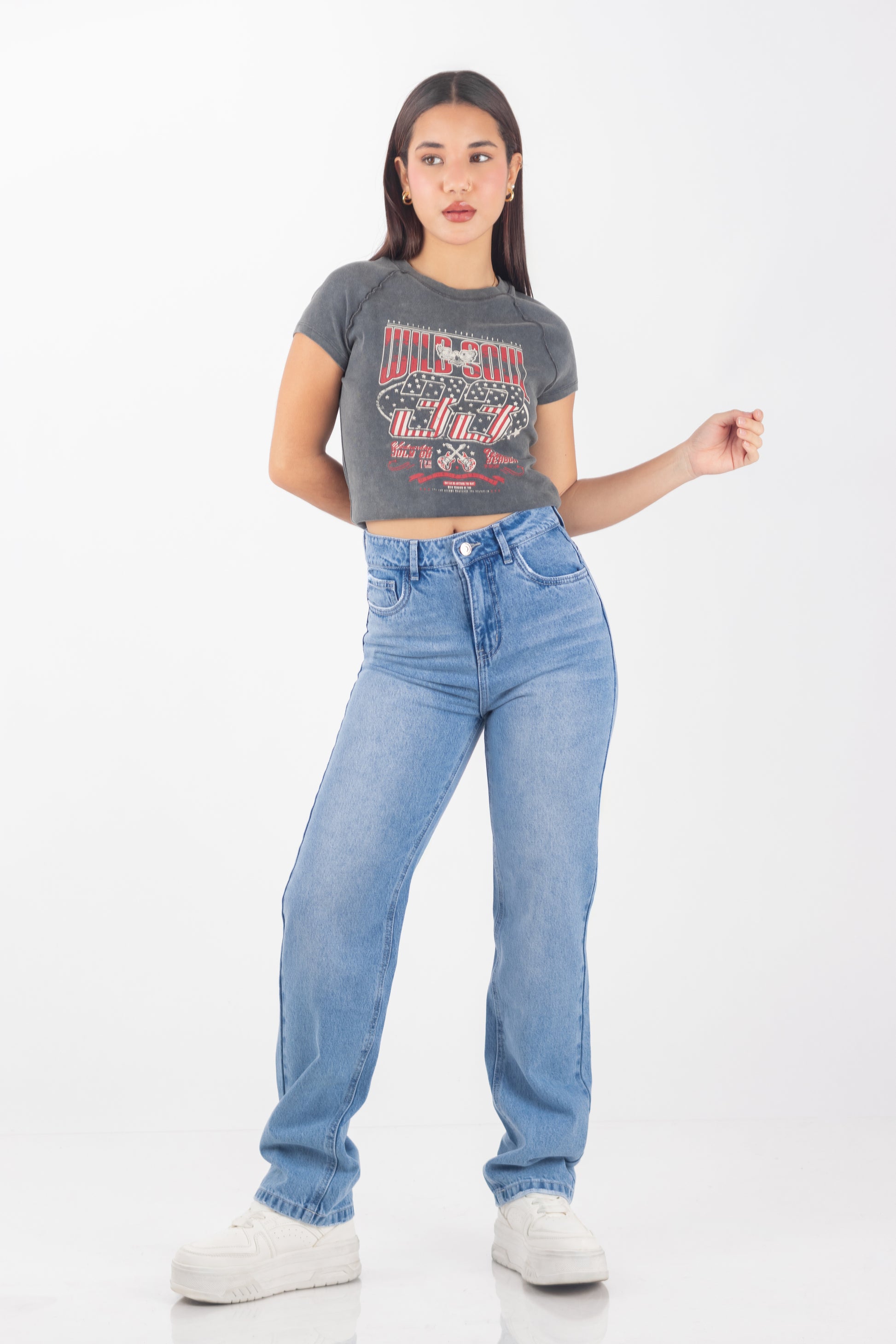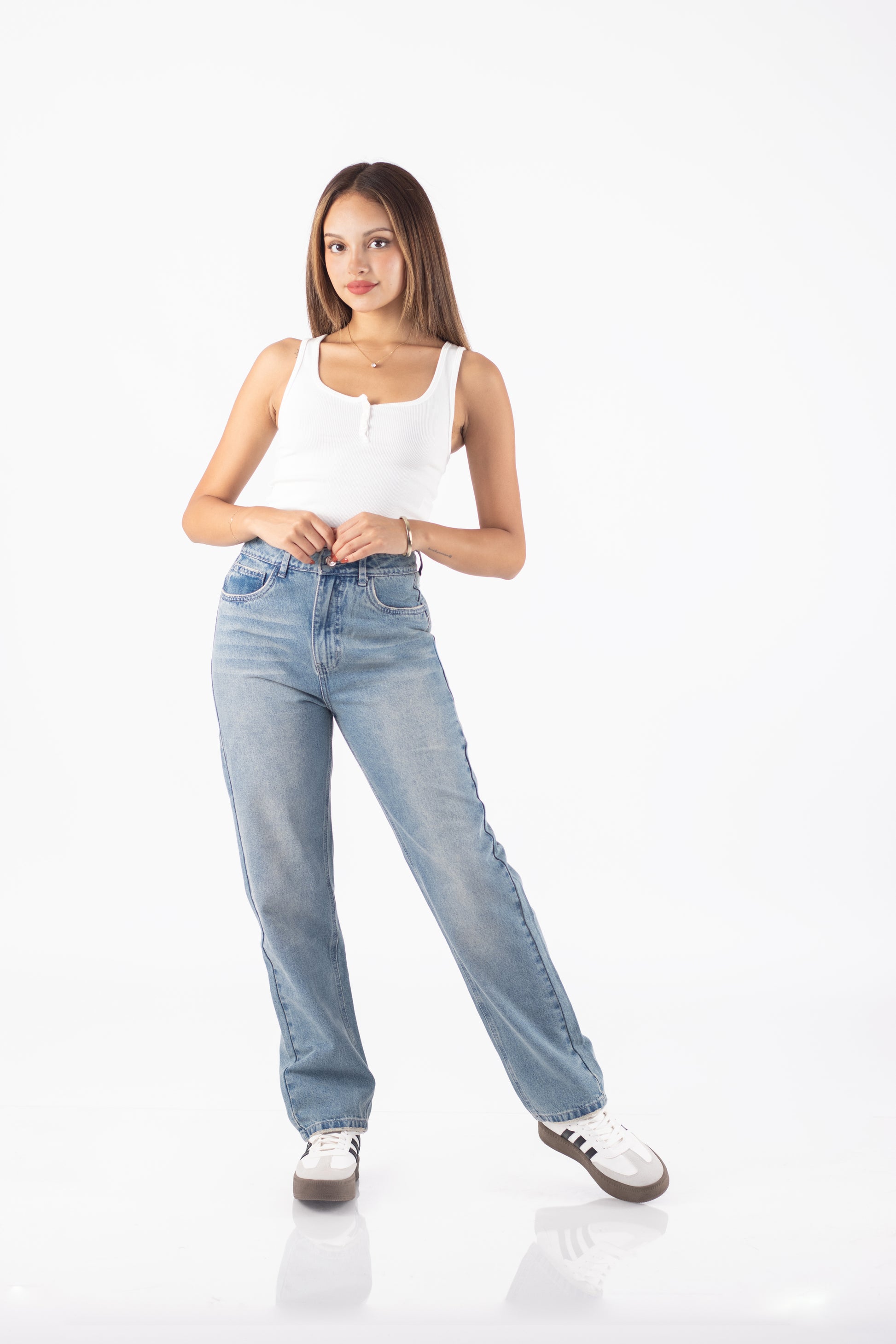 Denim rígido, con corte recto, caída holgada y tiro alto.