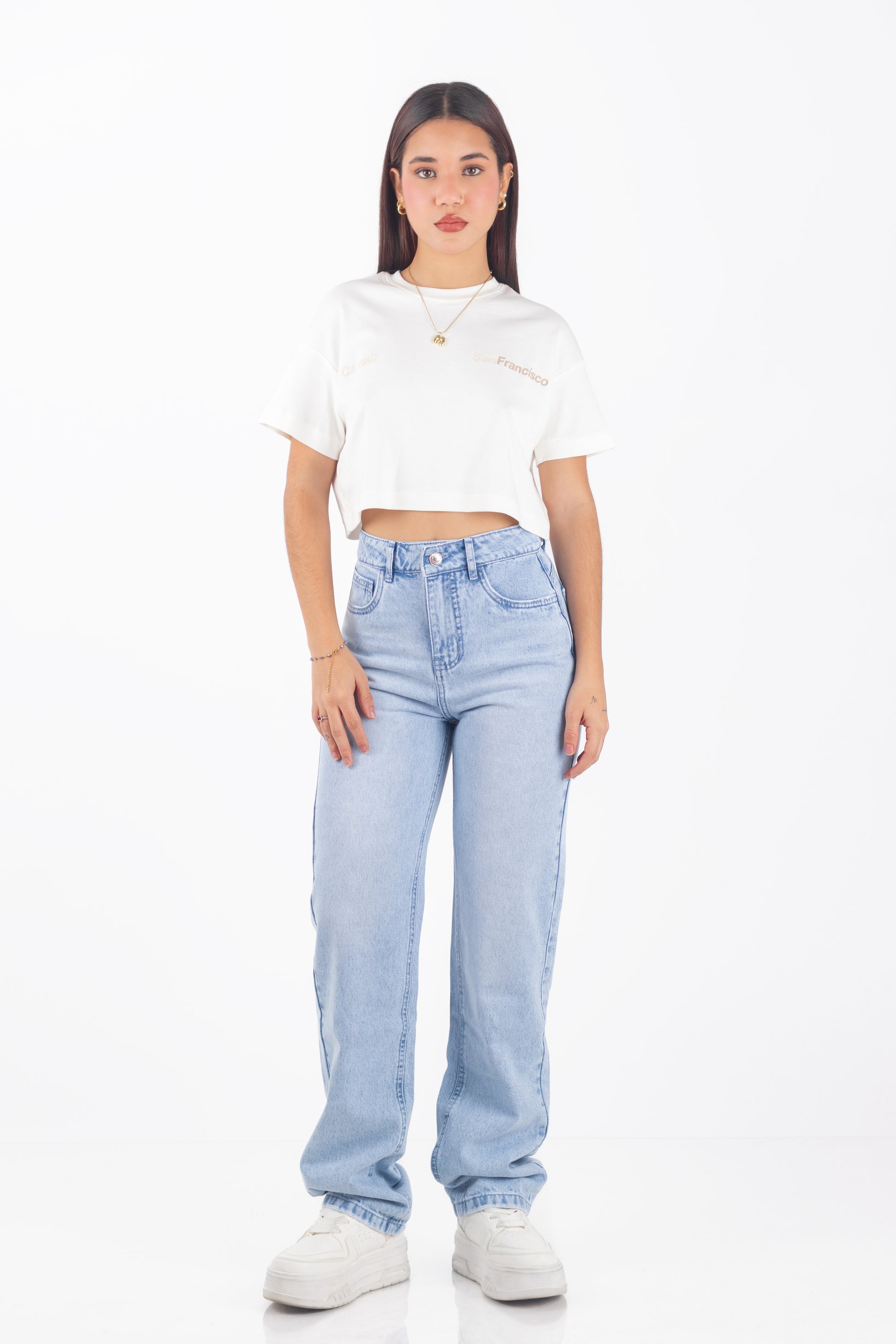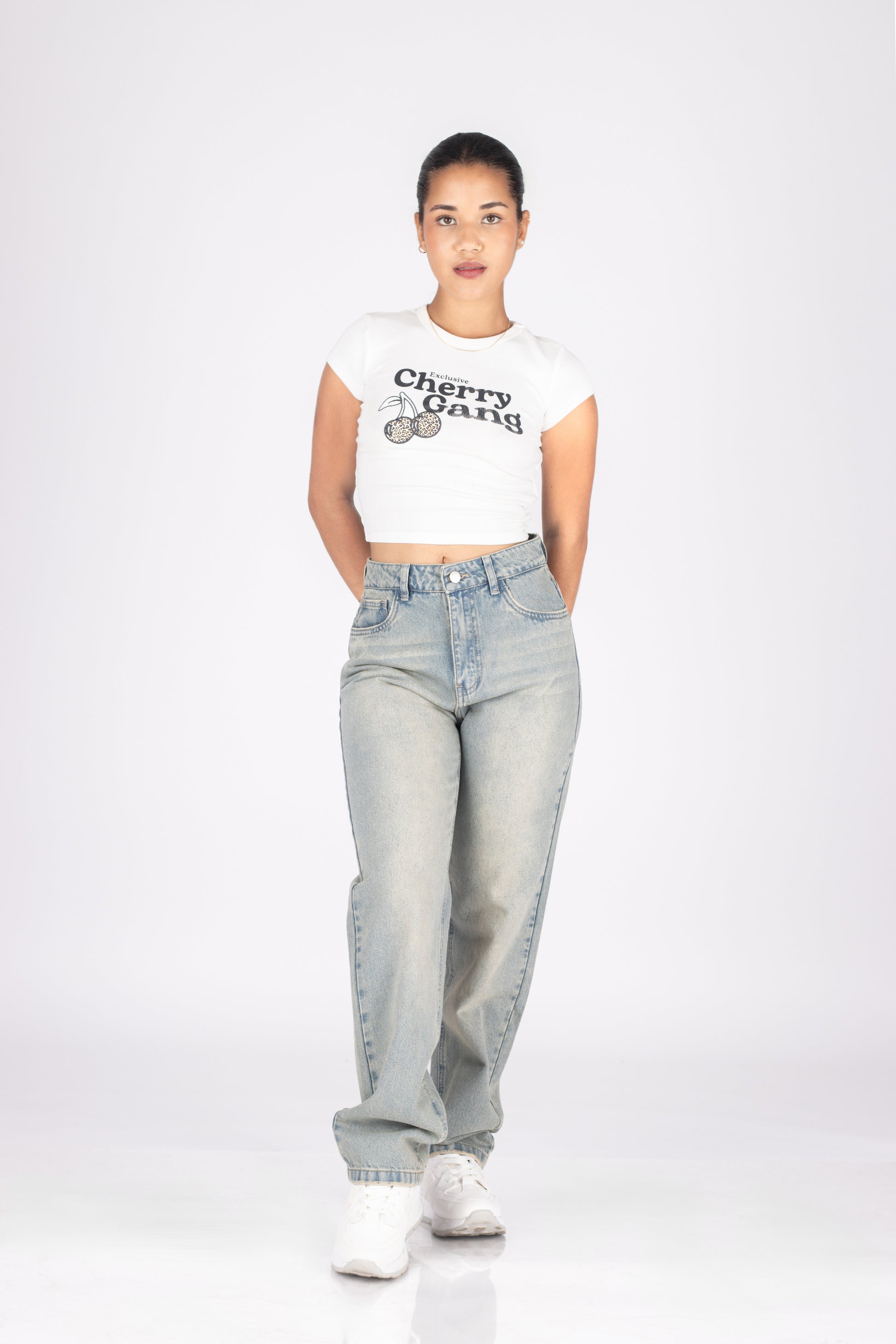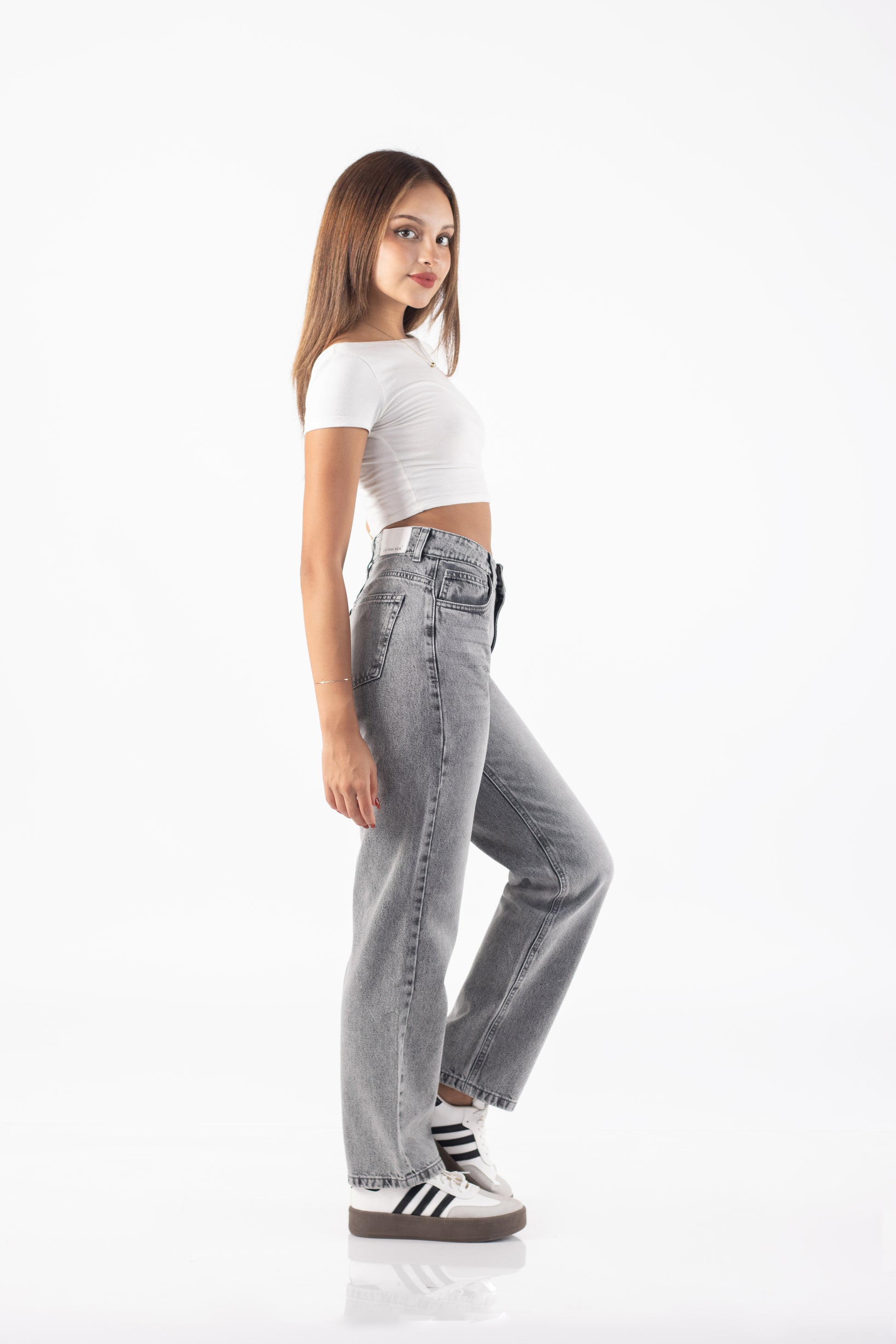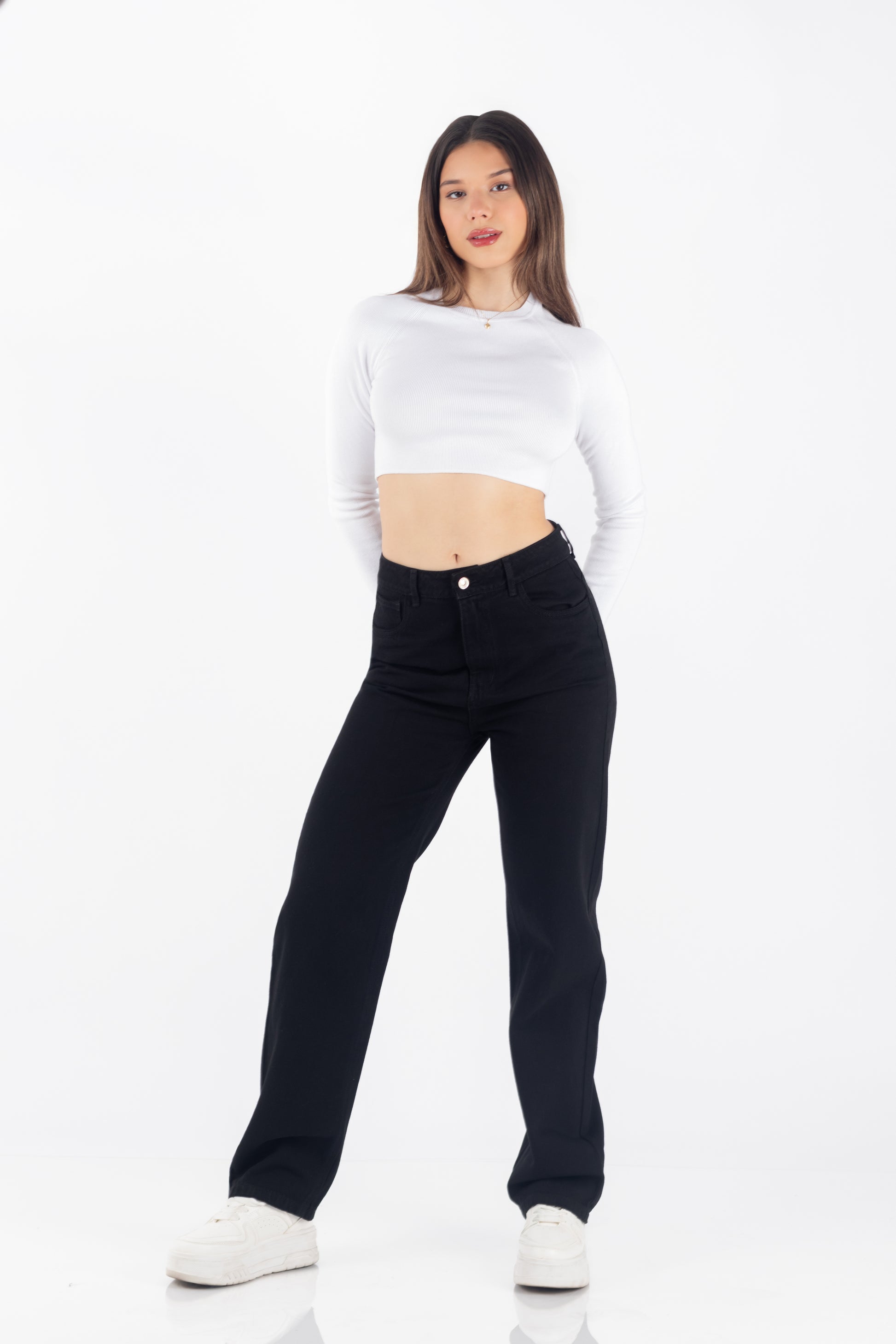 Denim rígido, con corte recto, caída holgada y tiro alto.