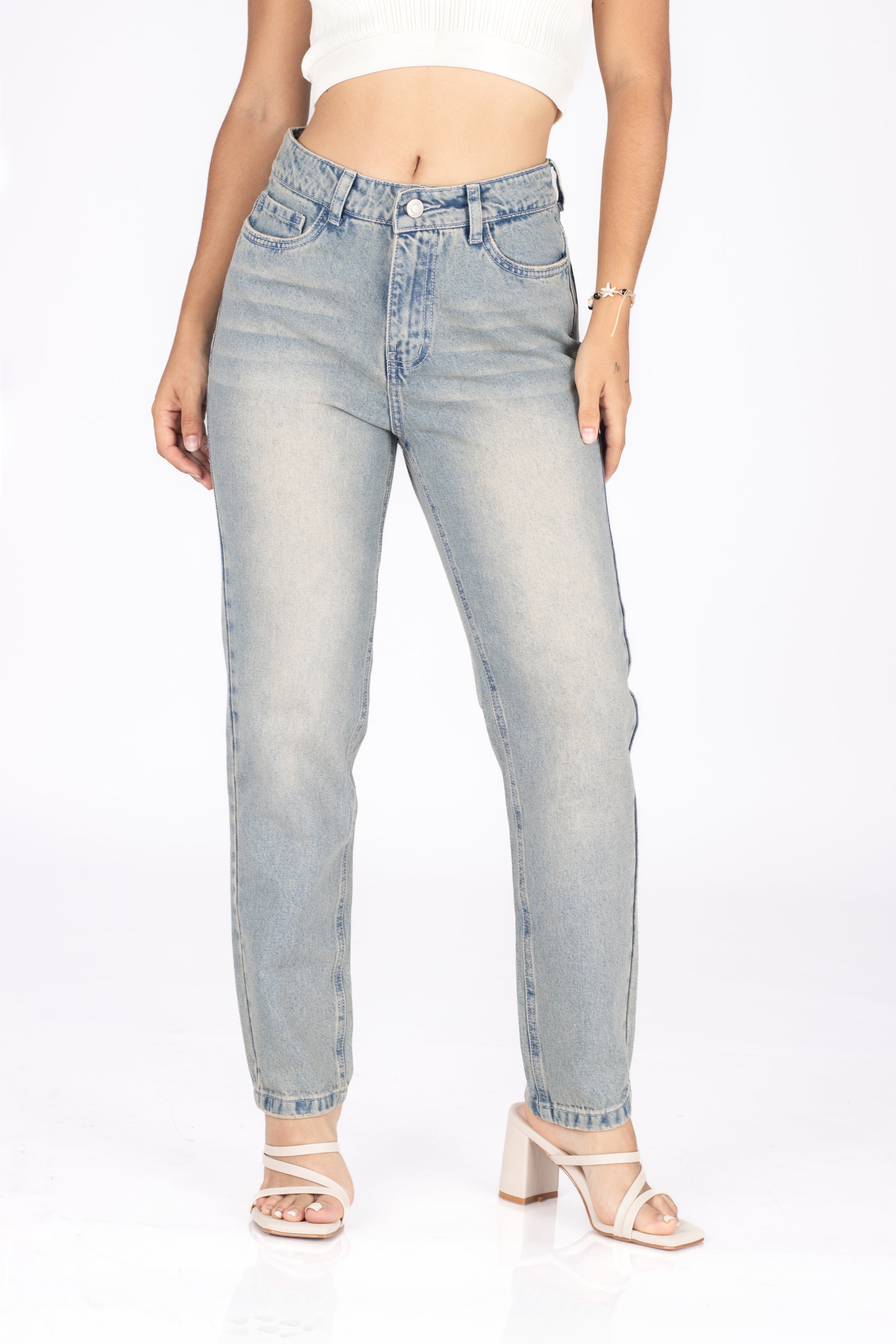 Denim rígido, de tiro medio, con caída semi holgada y ajustado a la cadera.