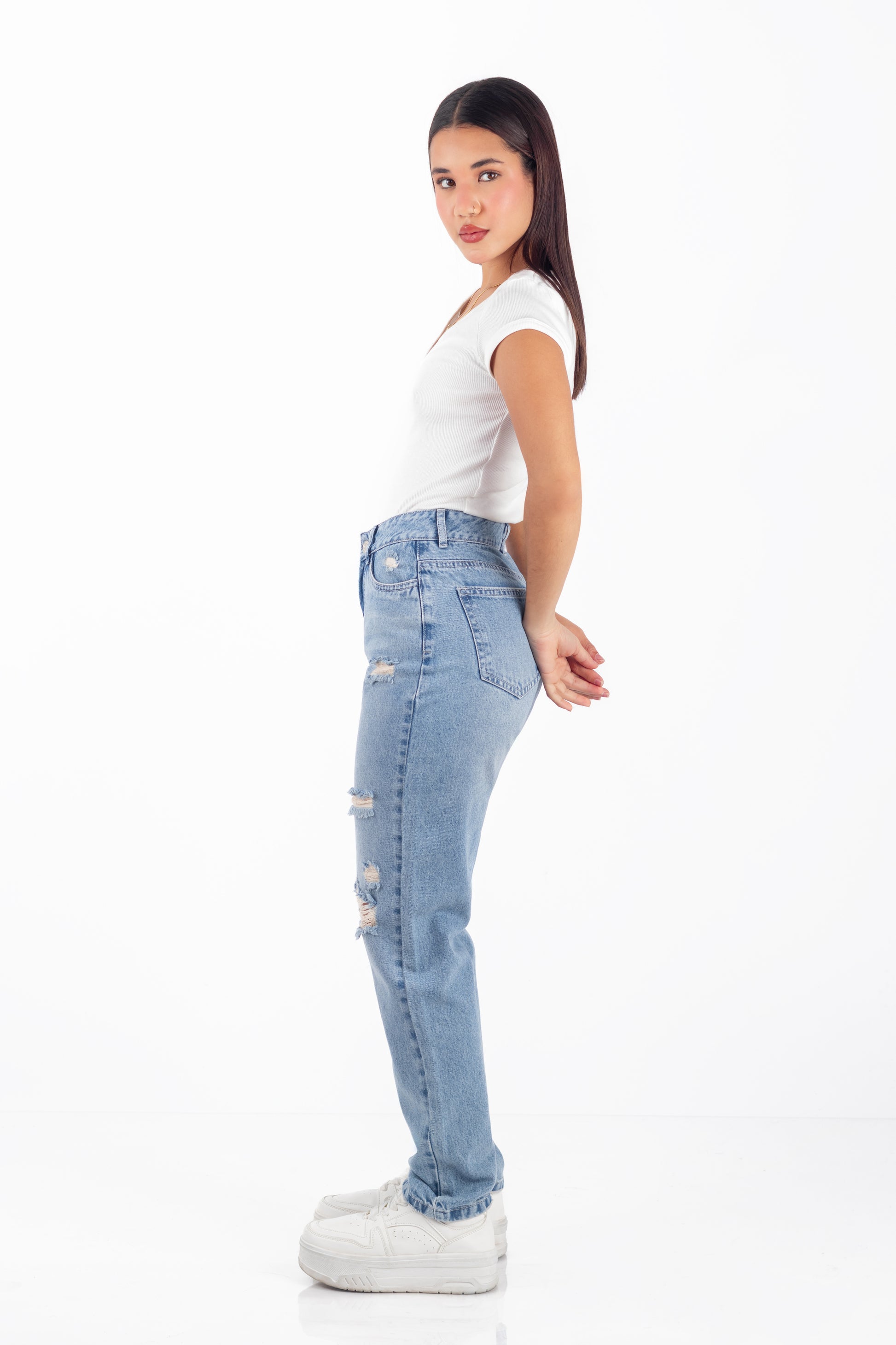 Denim rígido, de tiro medio y corte recto con caída estrecha. Tiene un rasgado sutil.