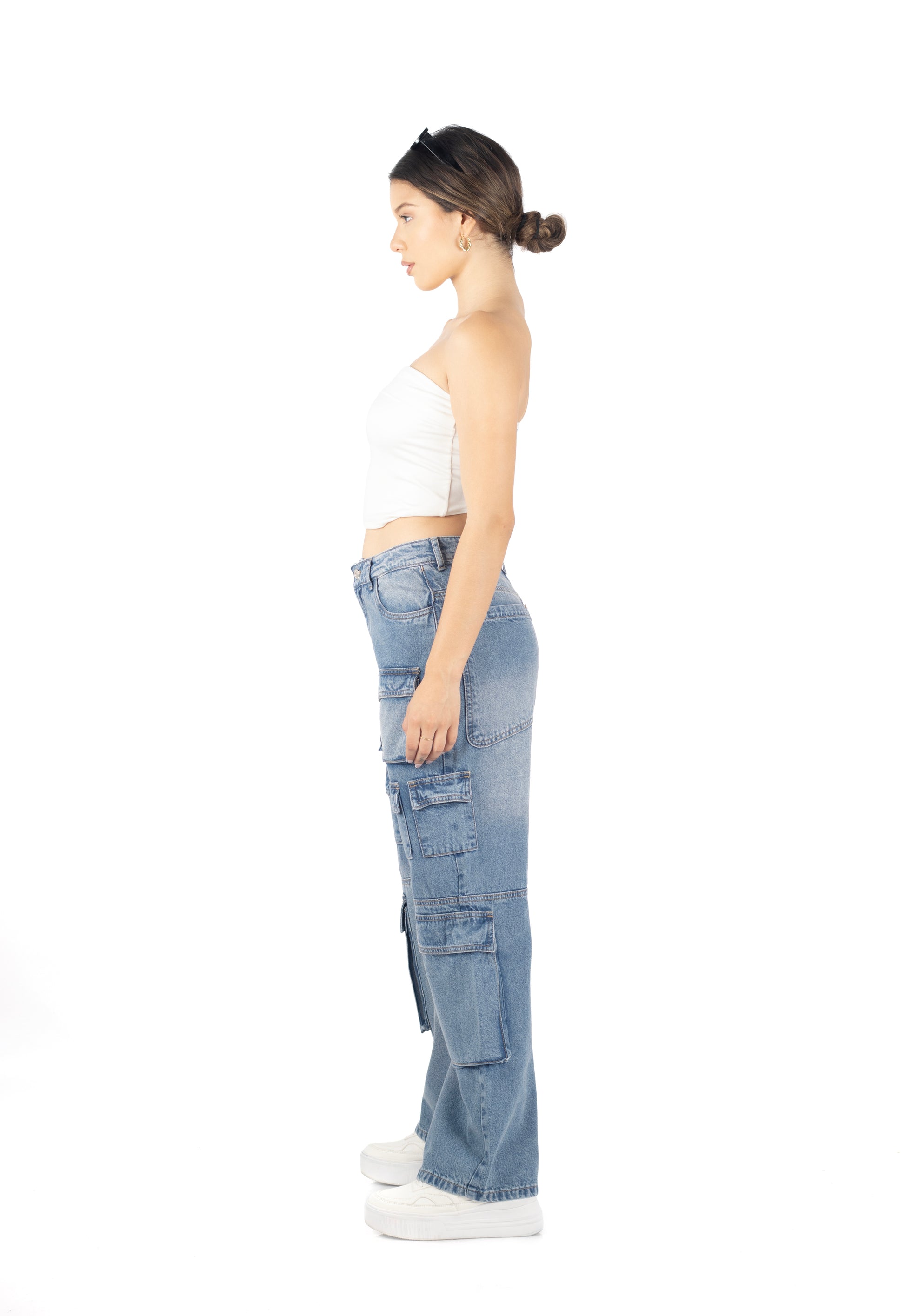 Denim rígido, tiro bajo, con multiples bolsillos.