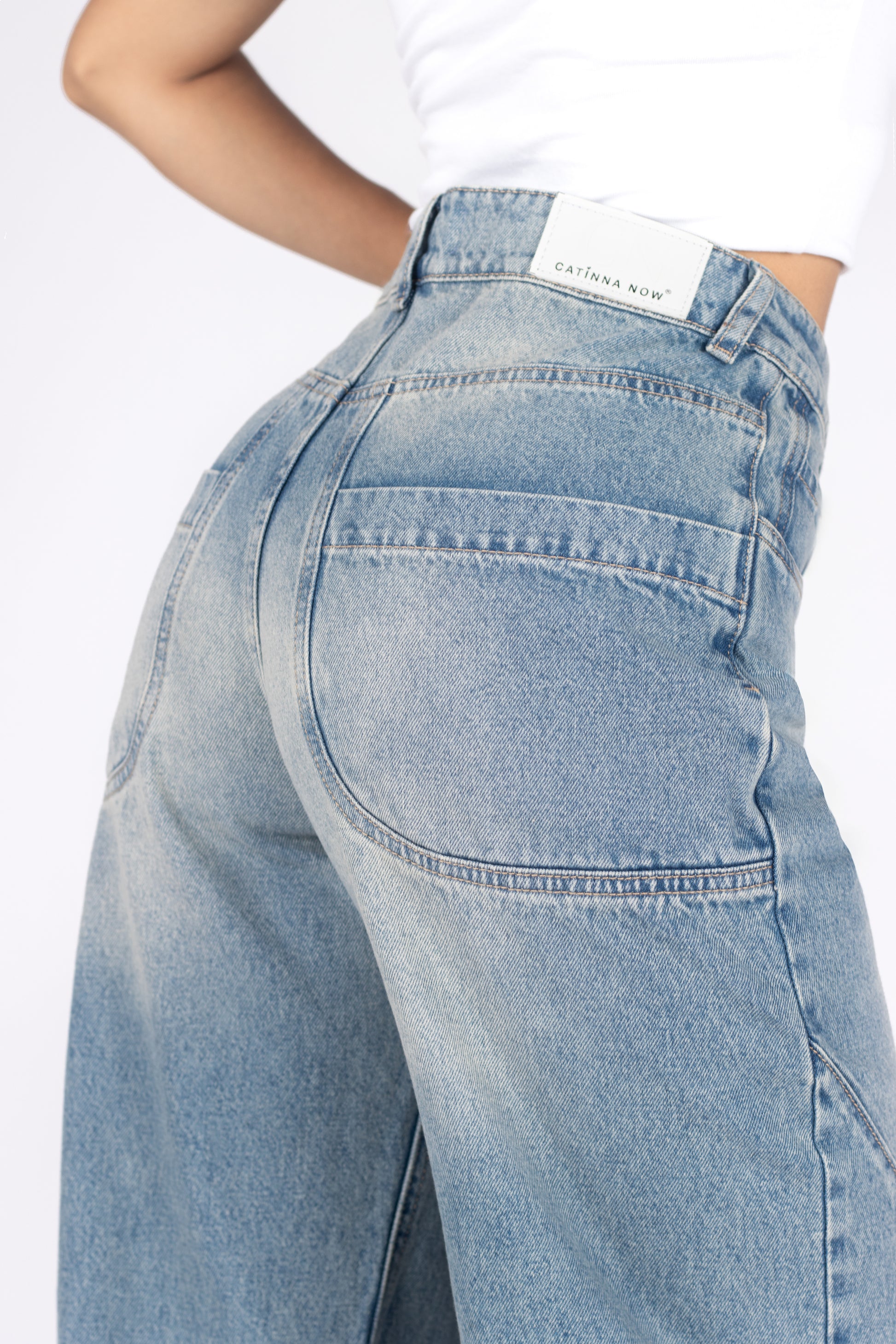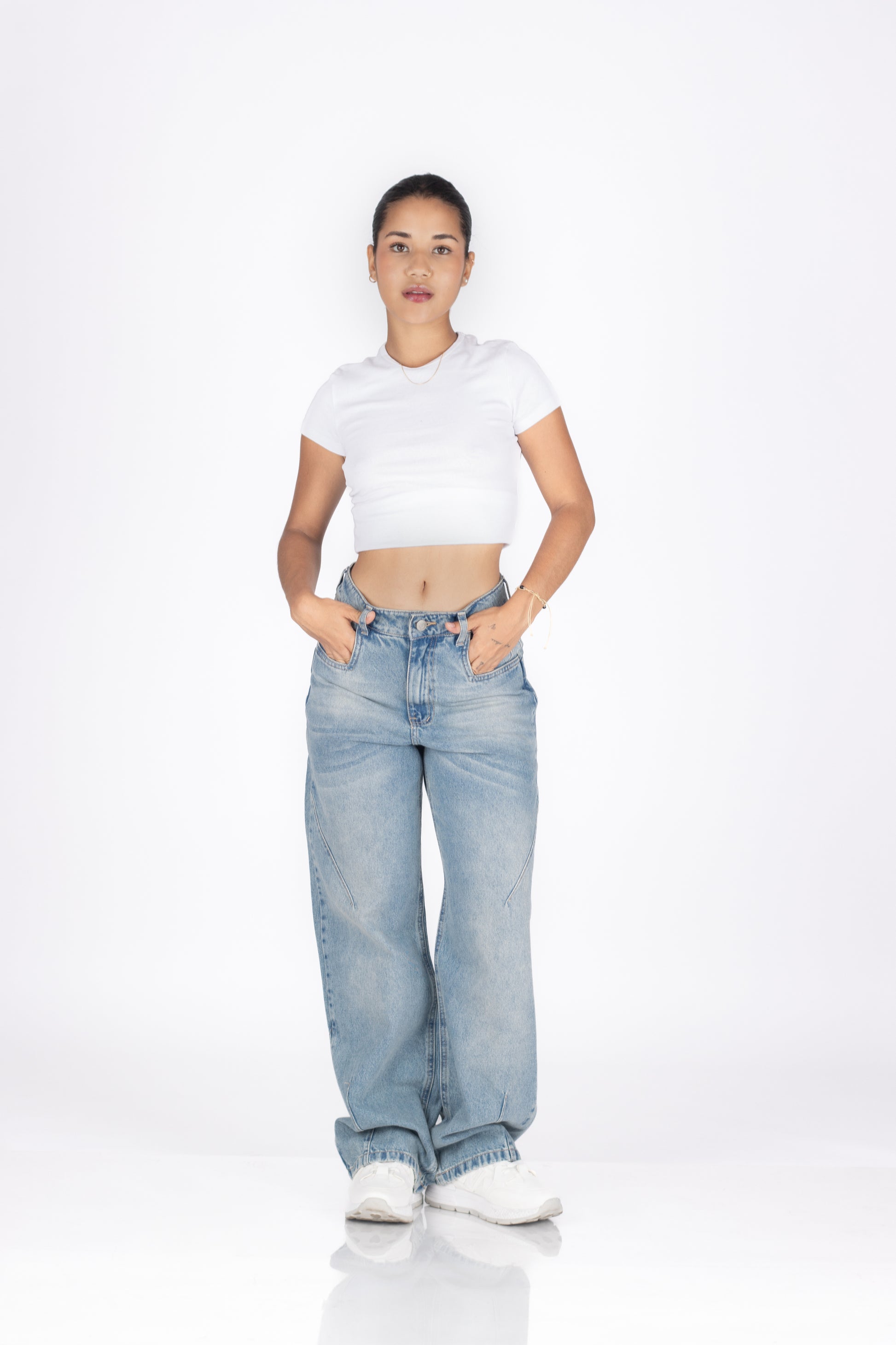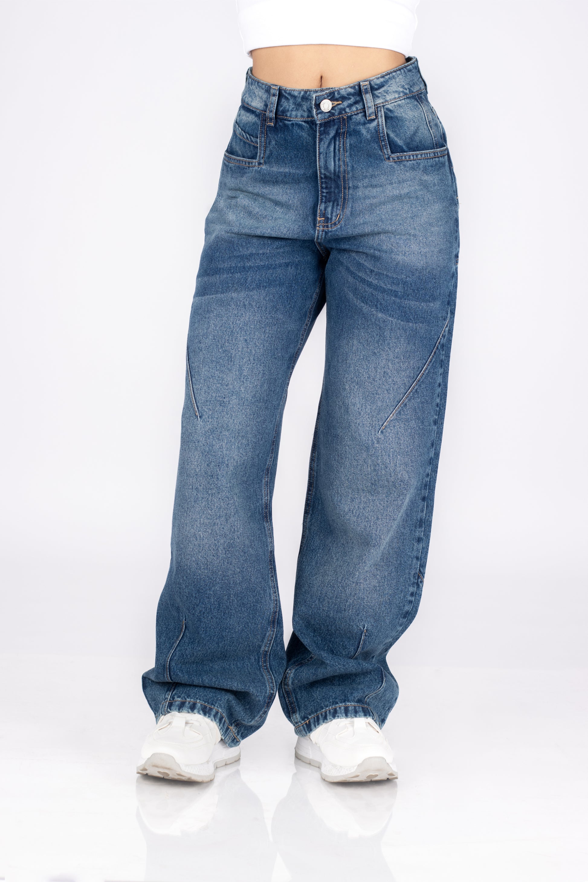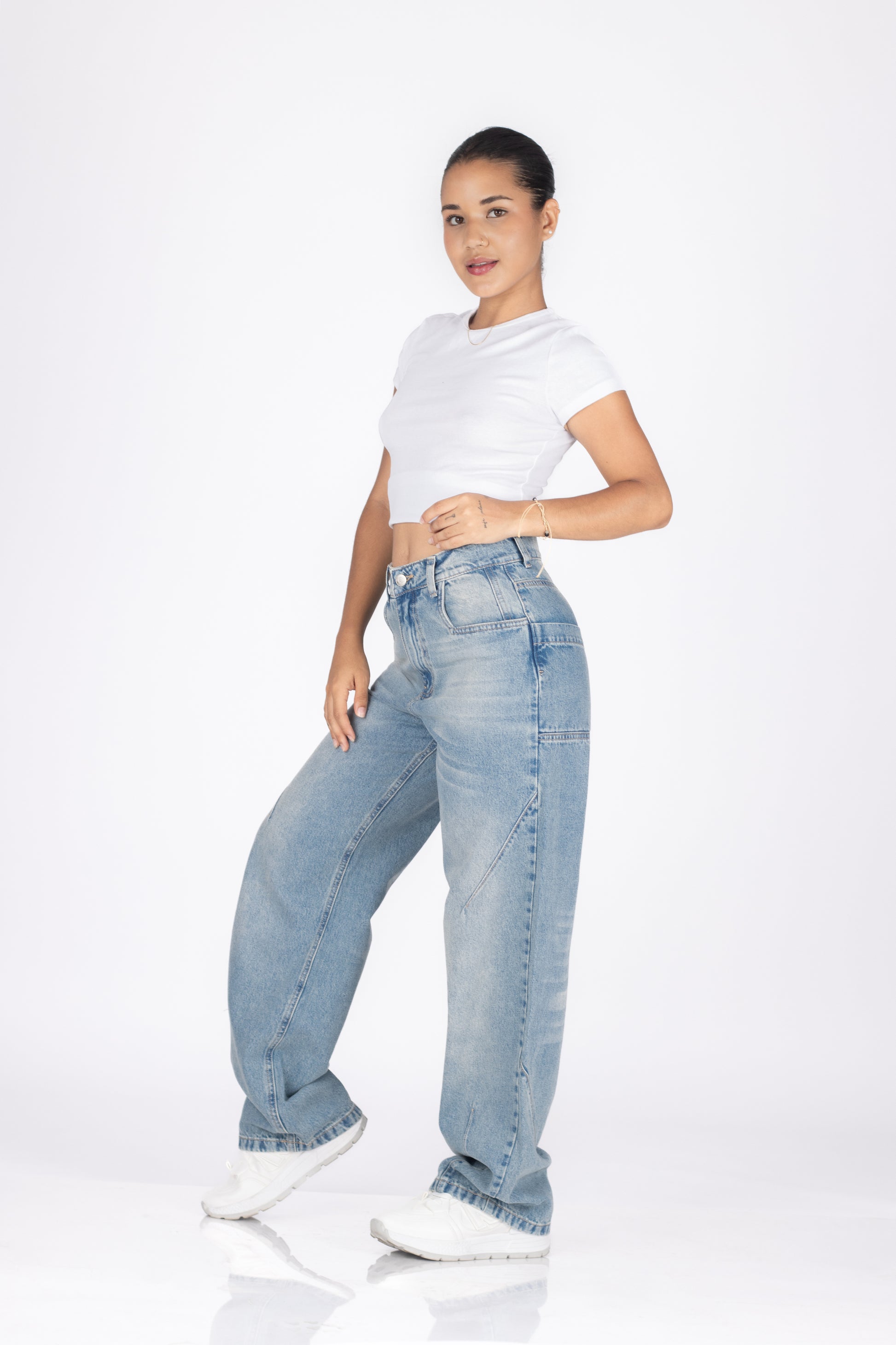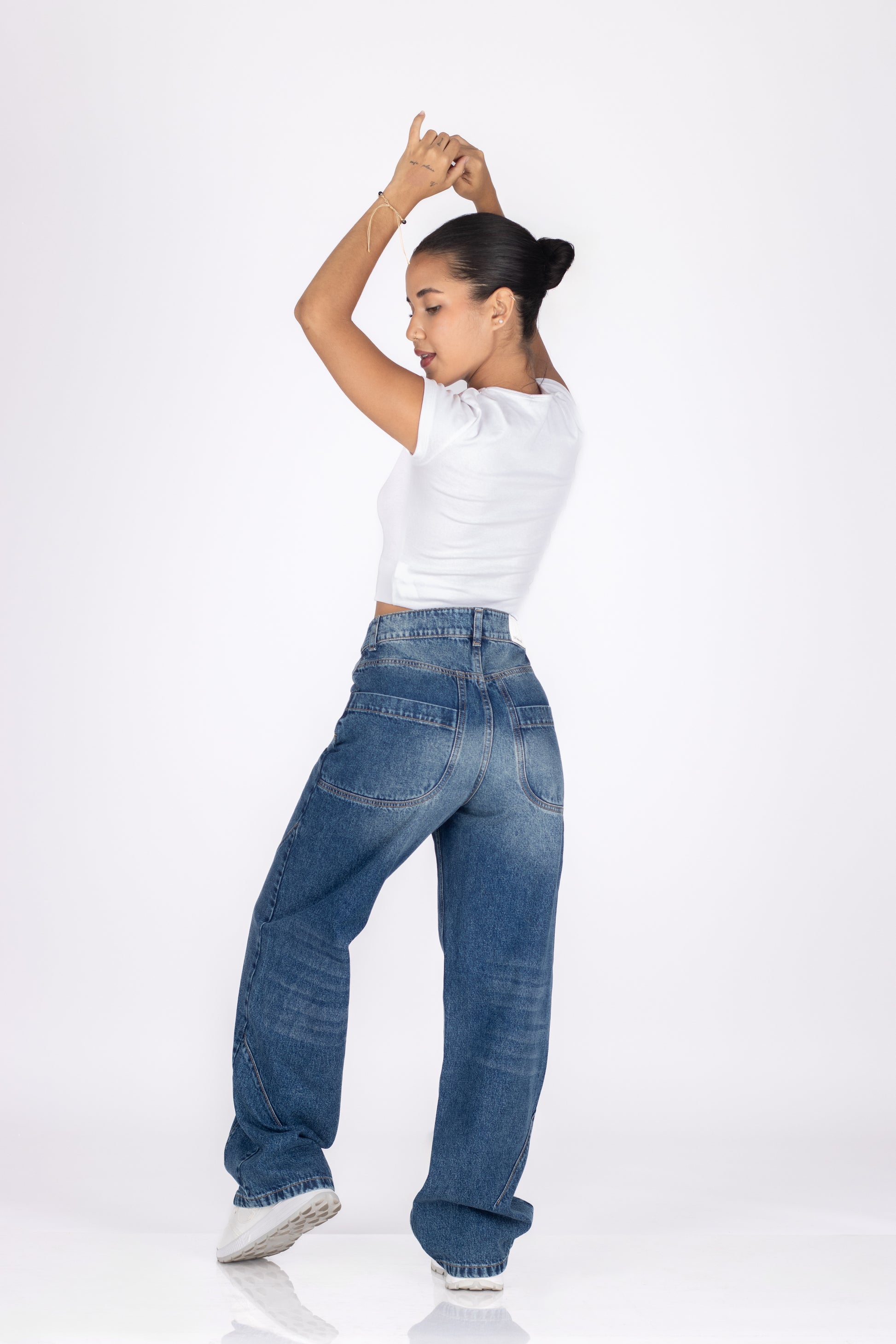 Denim rígido, de tiro medio, semi holgado con bolsillos delanteros y posteriores. Con detalles de corte en la altura de muslo y pantorrilla.