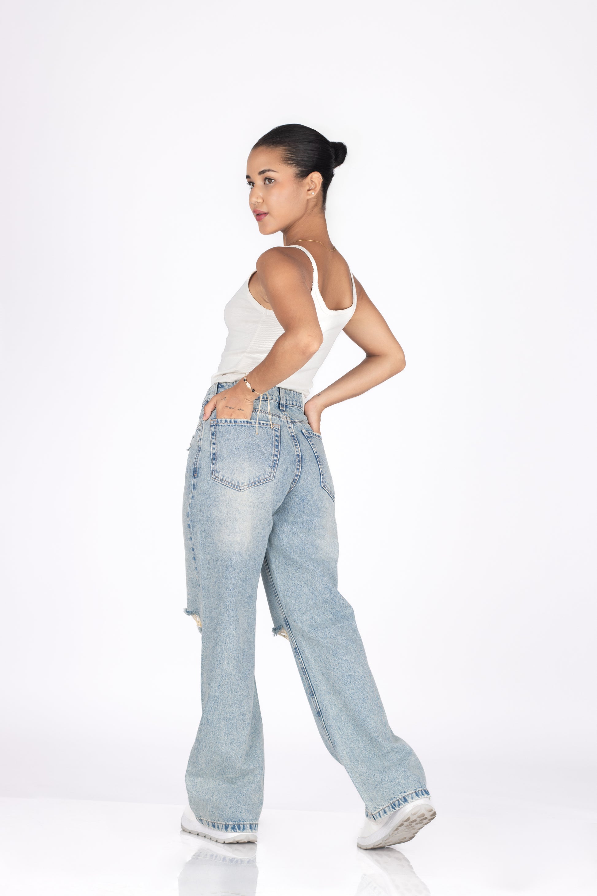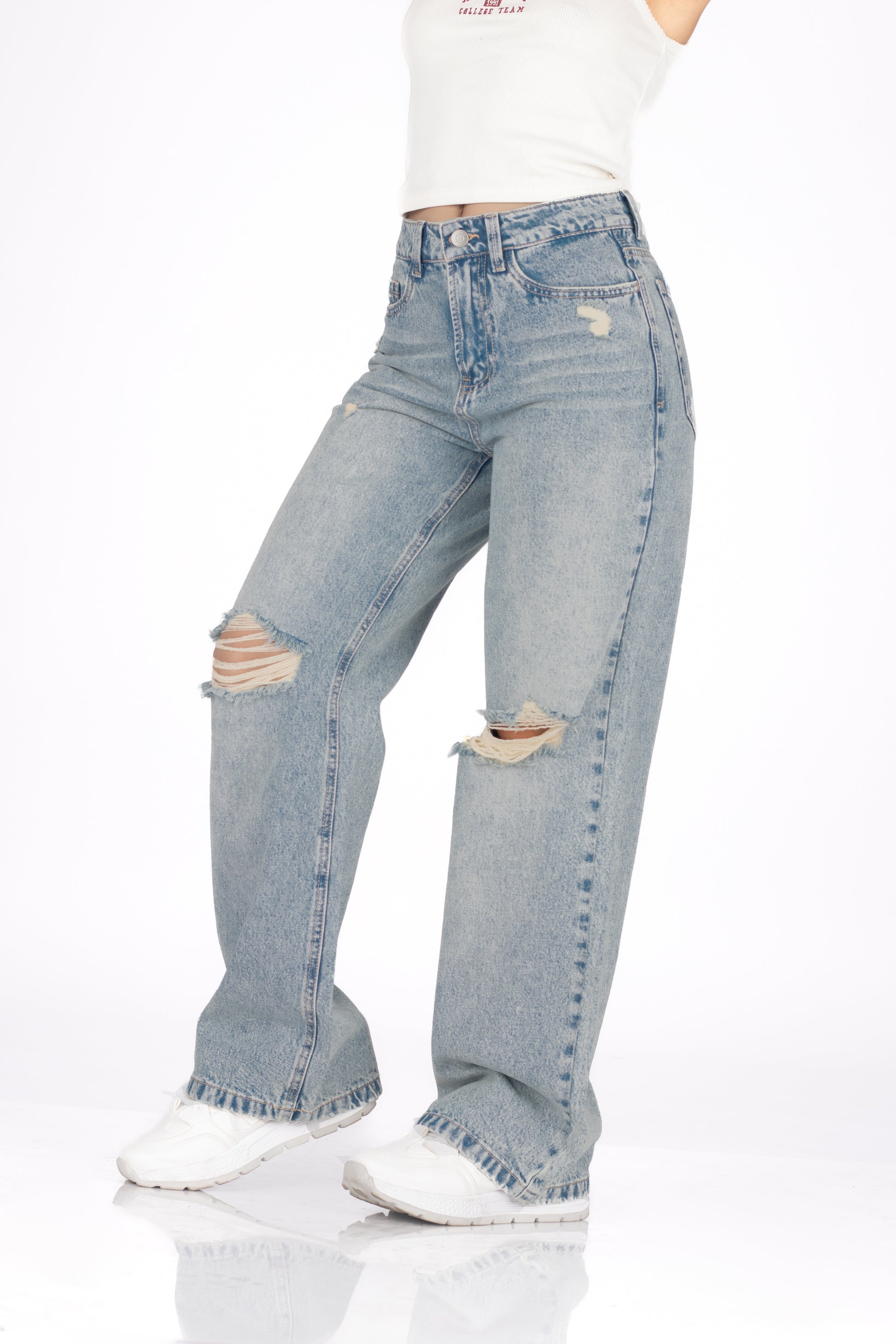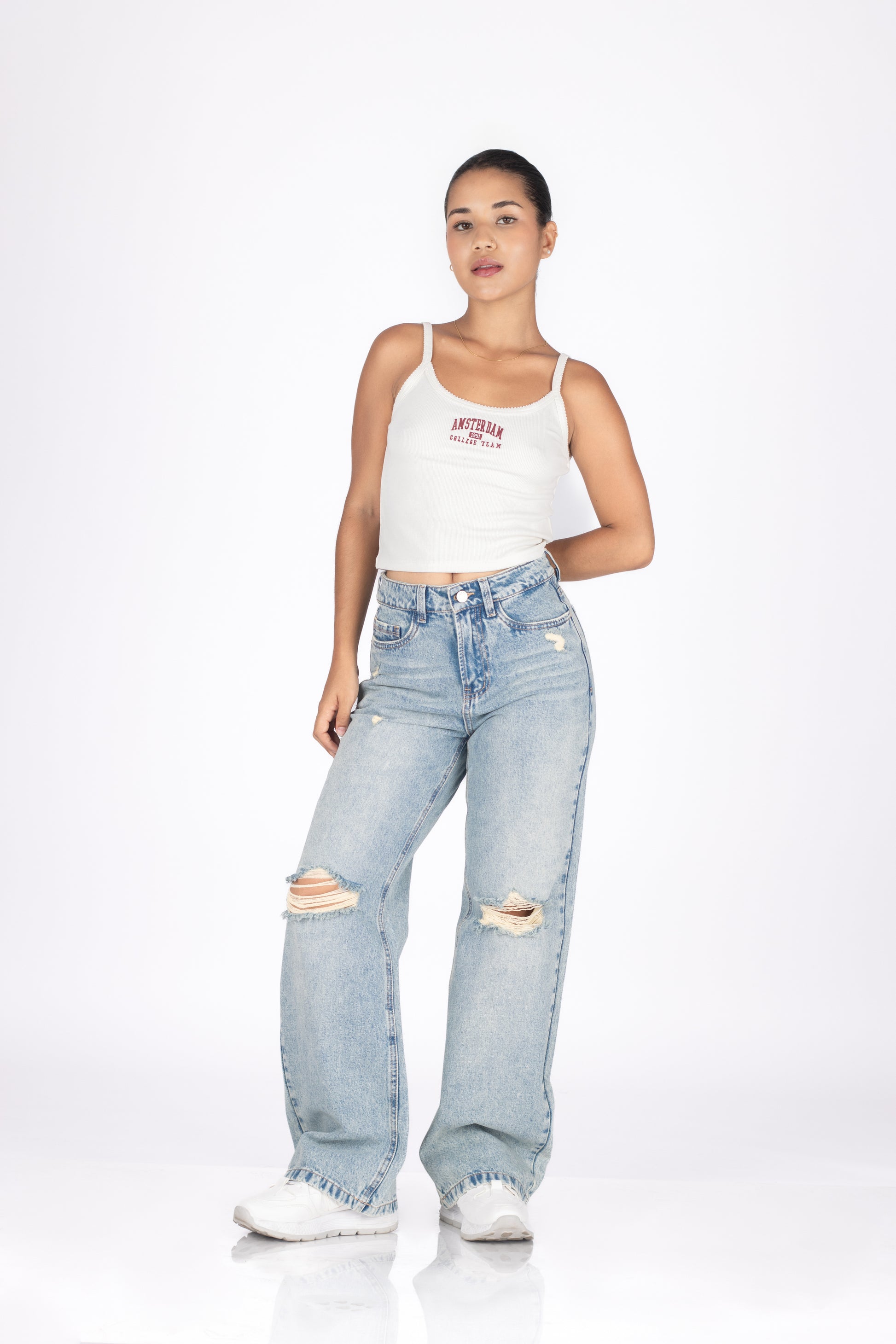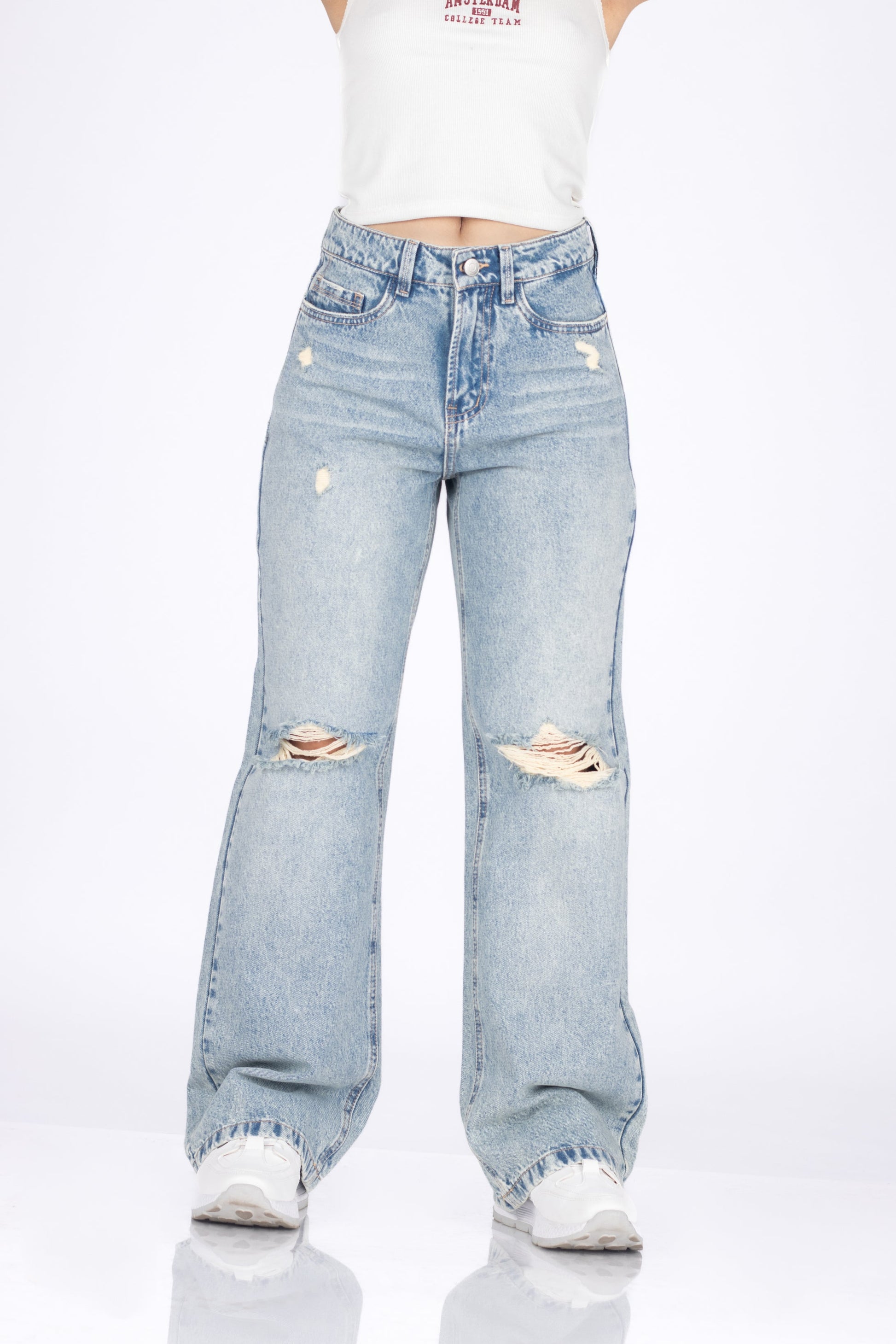 Denim rígido, de tiro alto, con rasgado sutil en las rodillas, con caída semi suelta.